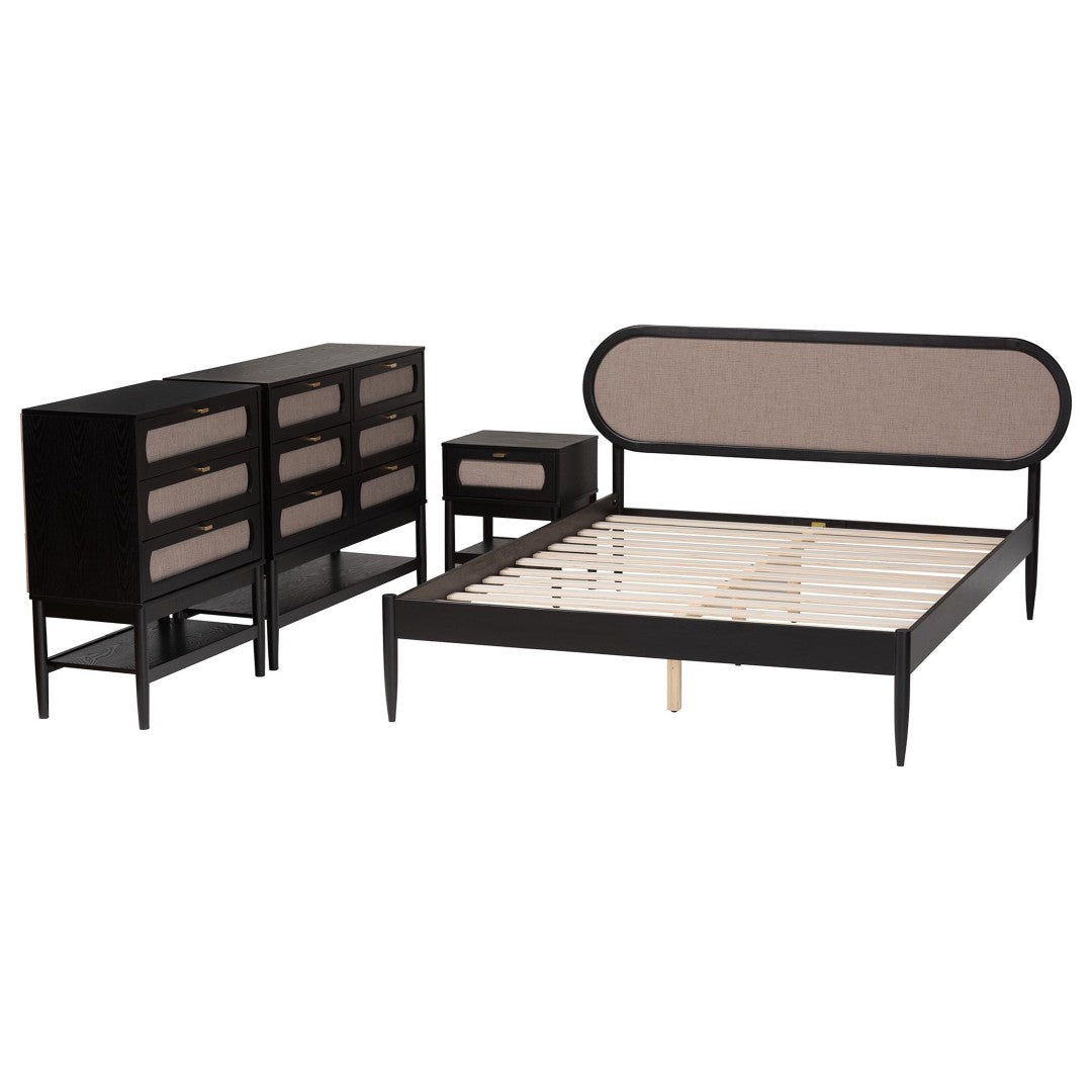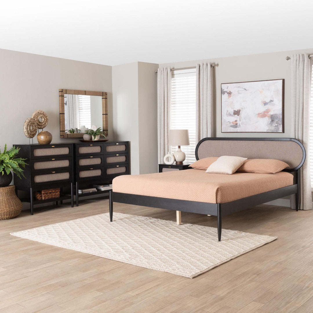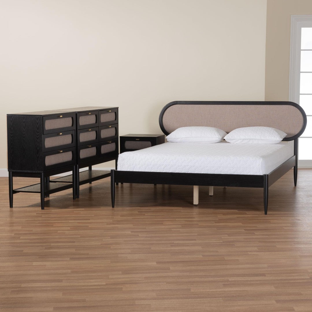 Create a serene, mid-century modern retreat with the Shirin 4-piece bedroom collection. Thoughtfully crafted in Malaysia, this set pairs warm beige upholstery with black wood accents and tapered legs to deliver a clean, contemporary silhouette that’s both comfortable and functional. Upholstered headboard and drawer fronts add softness and visual depth, while a solid rubberwood and engineered wood frame ensures lasting stability. The design uses wood slats for mattress support, so no box spring is required.