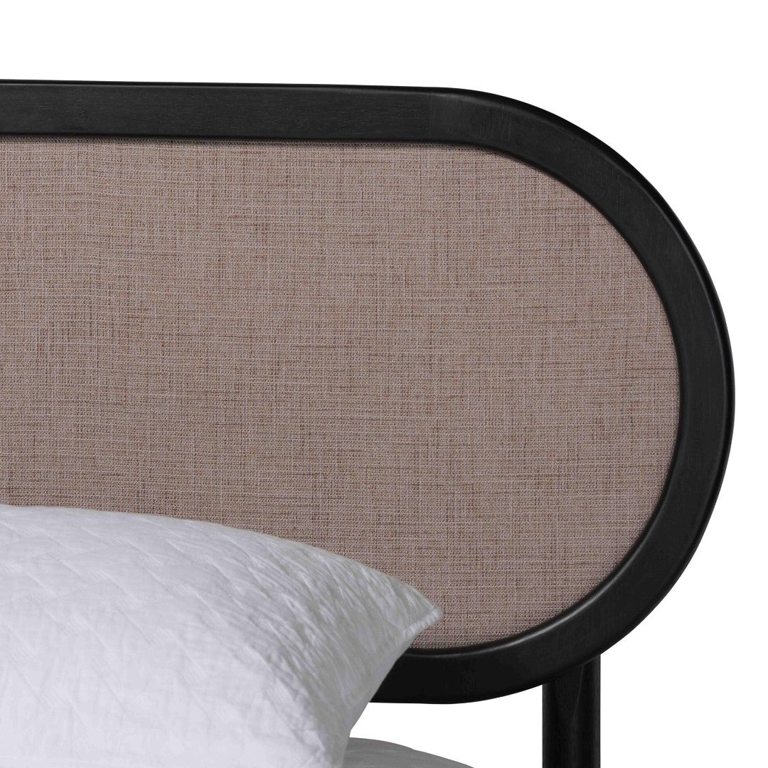 - Mid-century design details: Rounded headboard and leg posts, upholstered drawer fronts, and clean geometric lines.