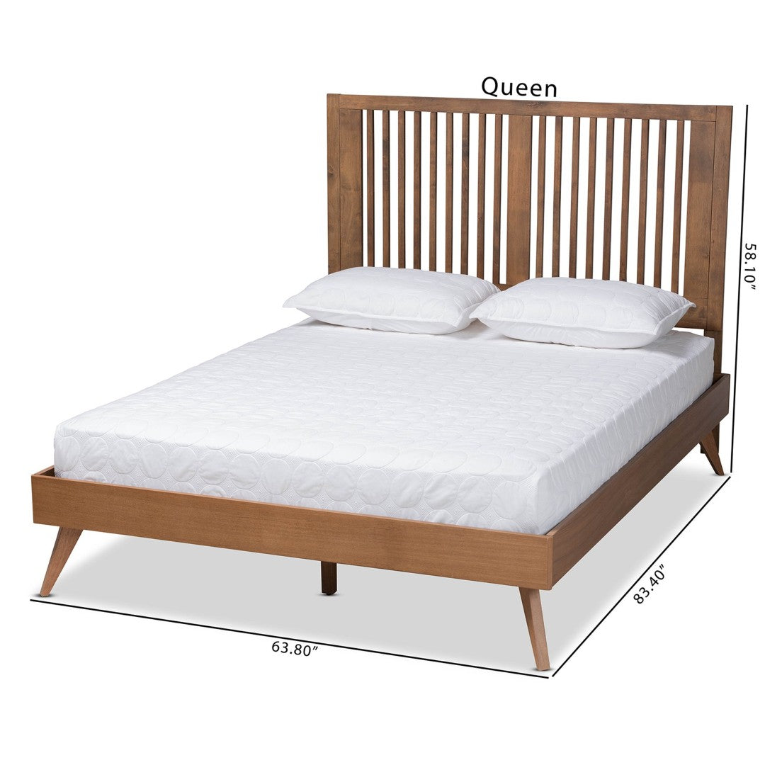 Bring a calm, mid-century modern presence to your bedroom with the Takeo platform bed. Crafted in Malaysia from solid rubberwood and engineered wood with an ash walnut finish, this design blends rustic warmth and clean lines. The slatted headboard and low-profile frame create an open, airy feel while the internal wood slats provide sturdy, box-spring-free mattress support. Thoughtful details—angled legs, multiple headboard height options, and a streamlined silhouette—make the Takeo a versatile, easy-to-assemble foundation for modern and transitional interiors.