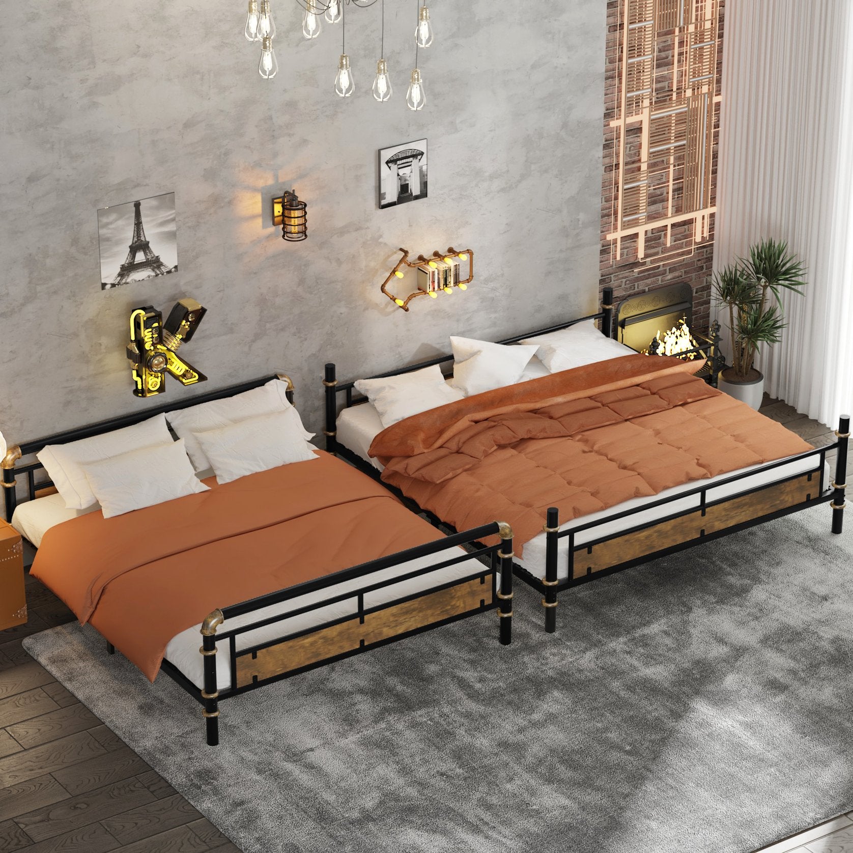 Bring modern industrial style and smart space-saving design to your bedroom with this Full XL over Queen metal bunk bed. Built from sturdy metal and finished with rustic wood accents, it blends durability, comfort, and clean lines to suit teens, guest rooms, or shared spaces. Thoughtfully engineered for safety and everyday use, the detachable configuration lets you convert the bunk into two separate beds as needs change.