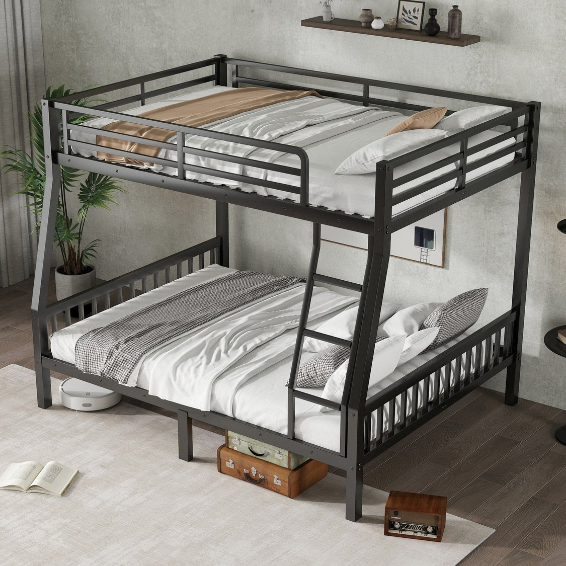- 【Space-Saving Metal Bunk Bed Design】: This space-saving full XL over queen metal bunk bed meets all your needs and expectations. Features easy access guardrails, build-in ladder and thick metal tube support slat system. Accommodating a XL full and Queen mattress, this sturdy metal bunk bed will last through years of play.