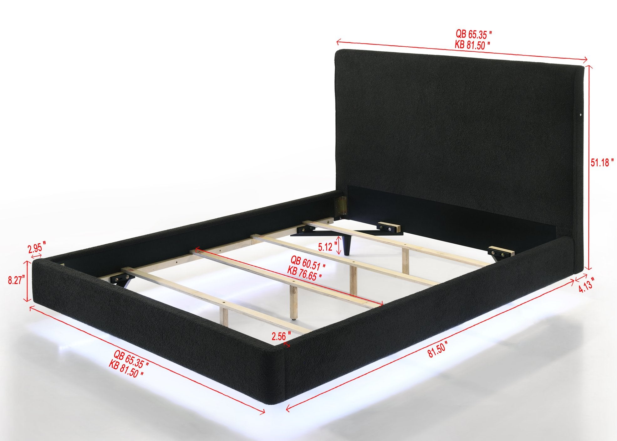 Transform your bedroom into a modern sanctuary with this contemporary queen panel bed. The striking high headboard and rich black boucle fabric create a luxe, tactile look while the built-in underbed LED lighting produces a stylish floating illusion. Designed for comfort and visual impact, the frame supports evening relaxation, reading in bed, and a clean, minimalist aesthetic.