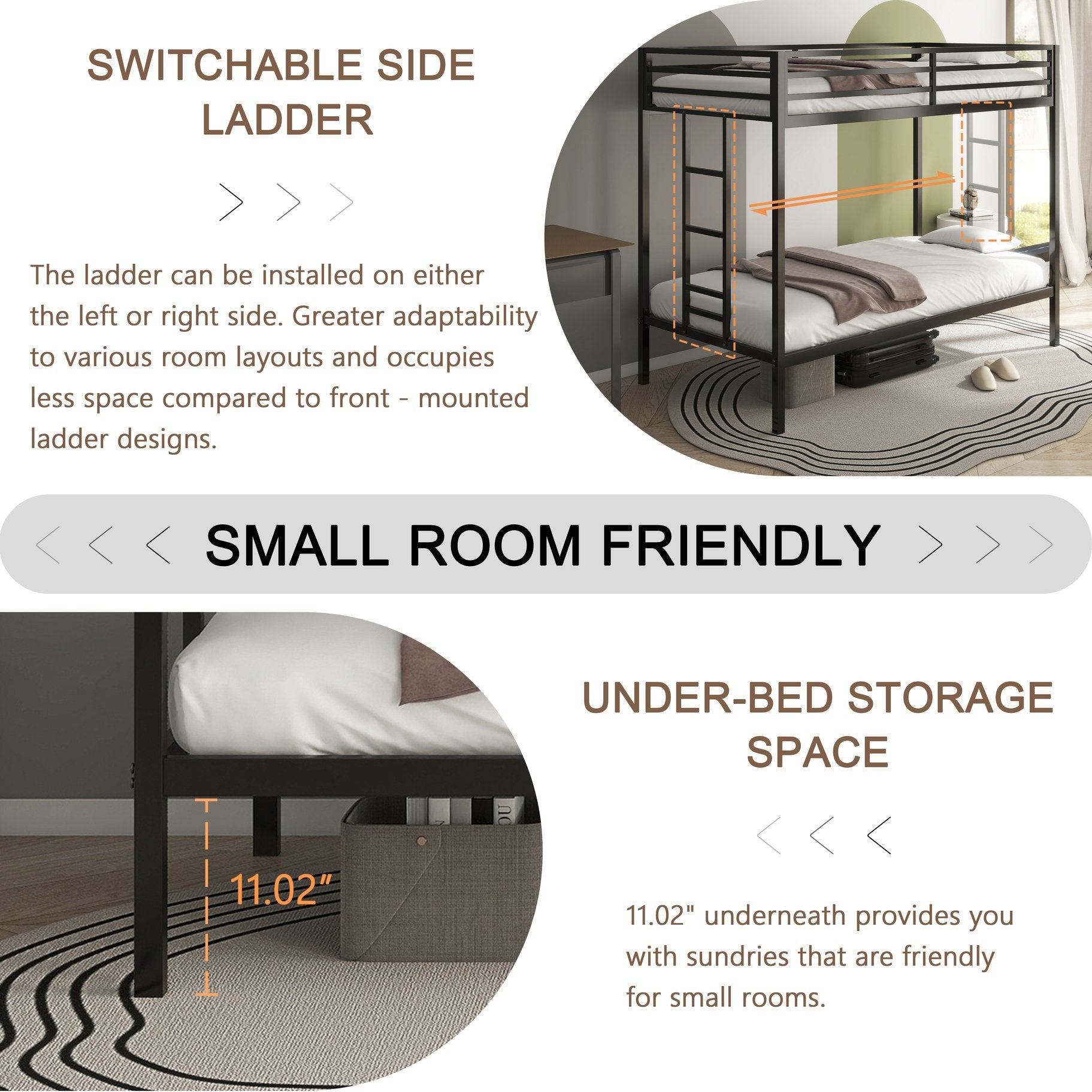 - Space-Saving: Our Twin Twin bunk bed is a great choice for families with many children! 10.6 inches underneath provide you with seasonal clothes or toys, friendly for small rooms.
