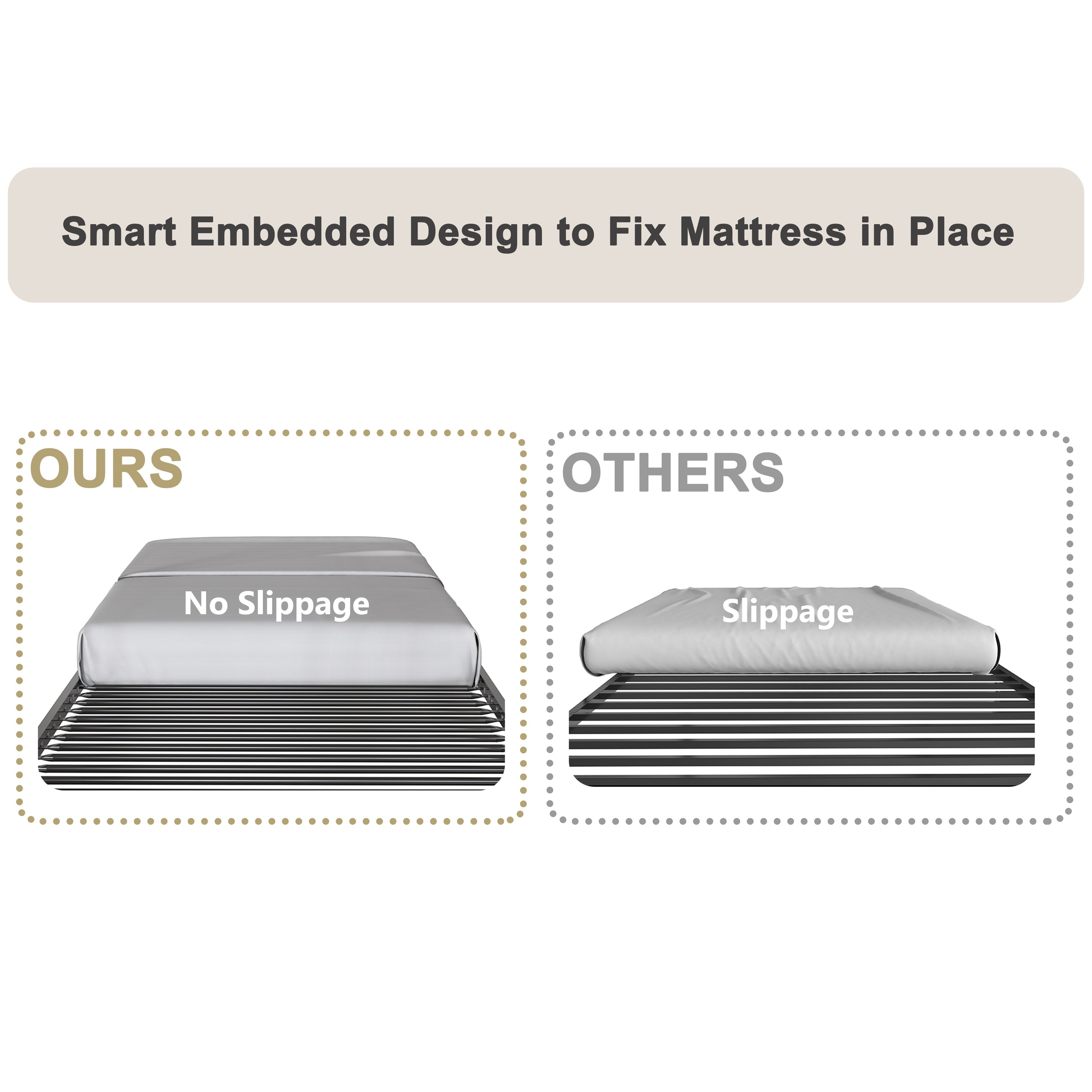 - Metal Slat Support: Pre-installed metal slats eliminate the need for a box spring and provide even mattress support; plastic plugs protect connections.