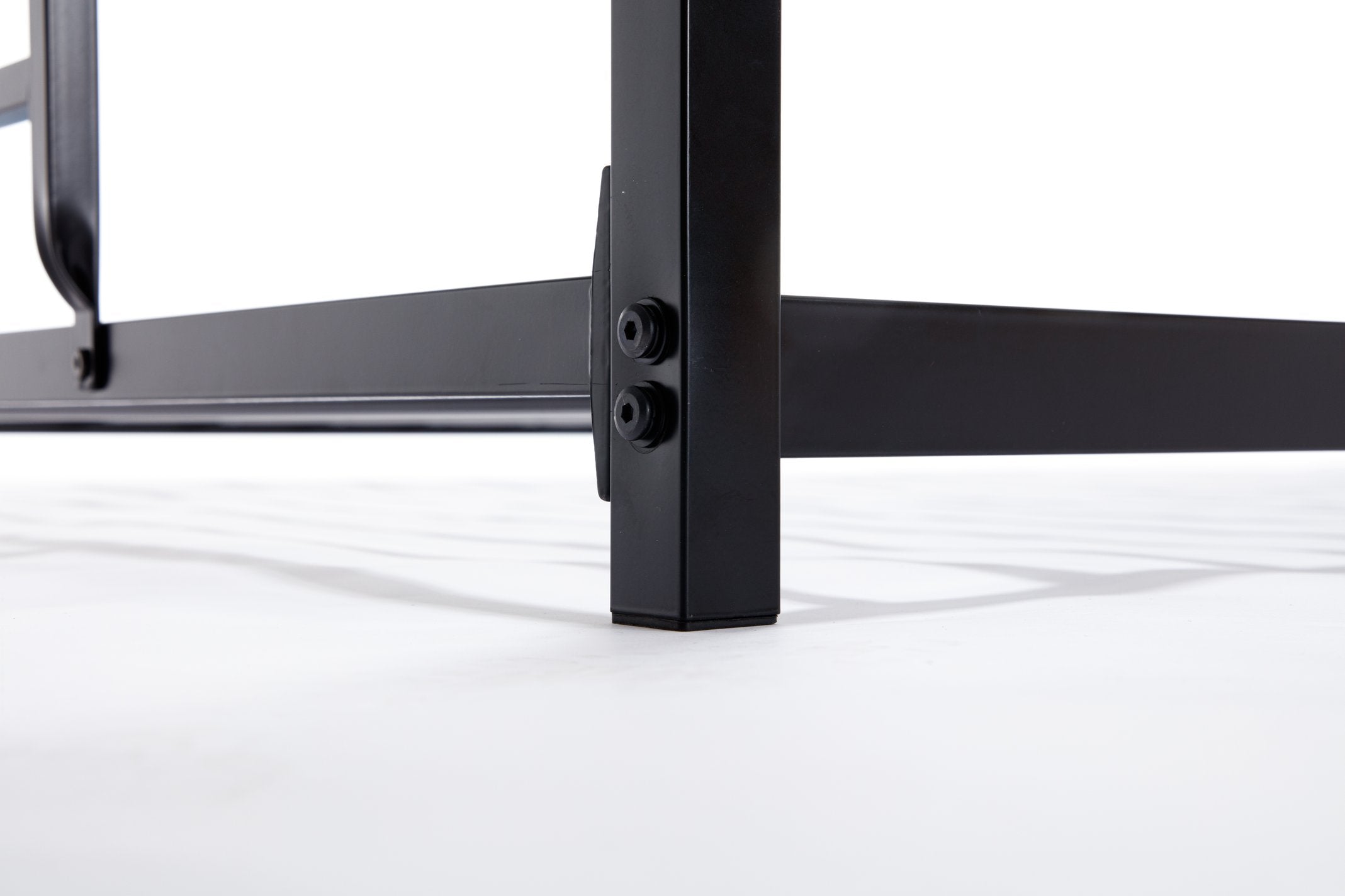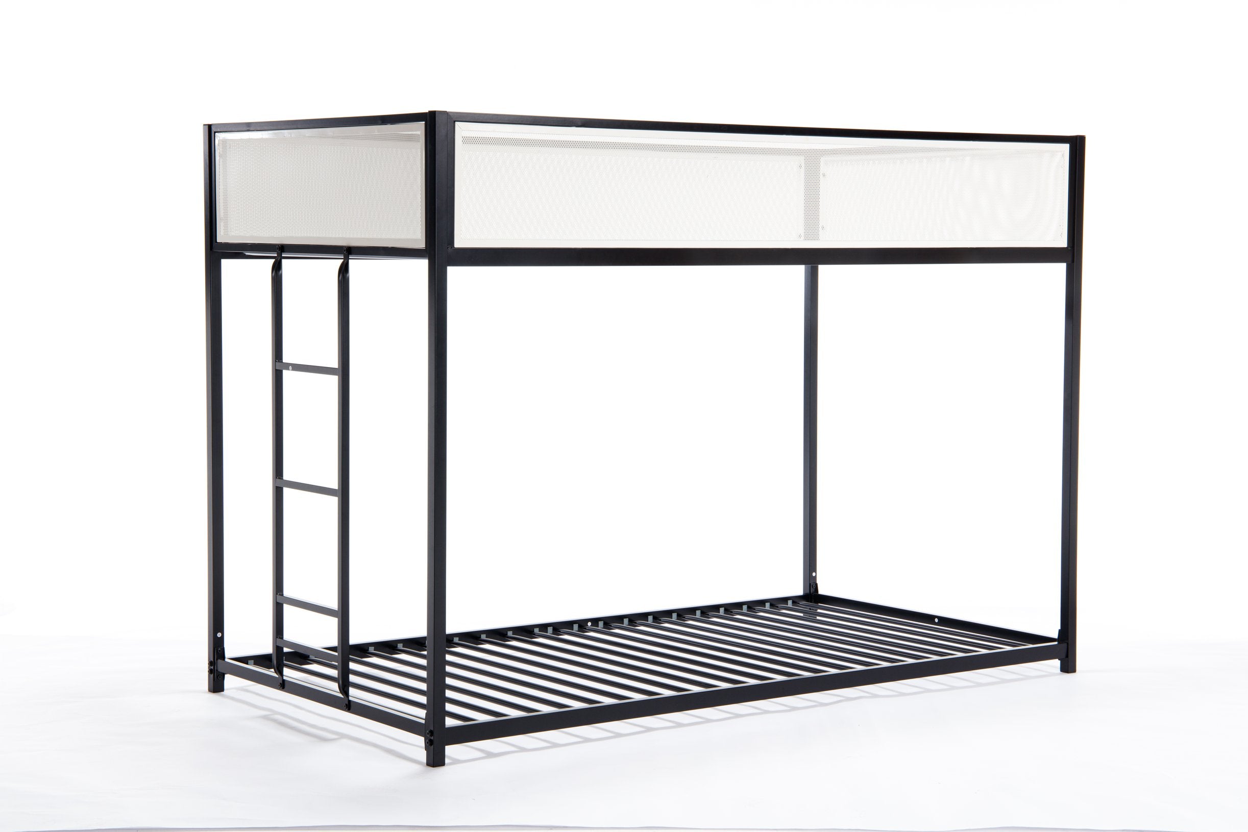 A sleek and sturdy twin-over-twin metal bunk bed designed for both kids and adults, offering a low-profile footprint, easy climbing, and enhanced safety features. Its minimalist black frame with white mesh guard rails blends with modern decor while prioritizing durability and comfort for everyday use.