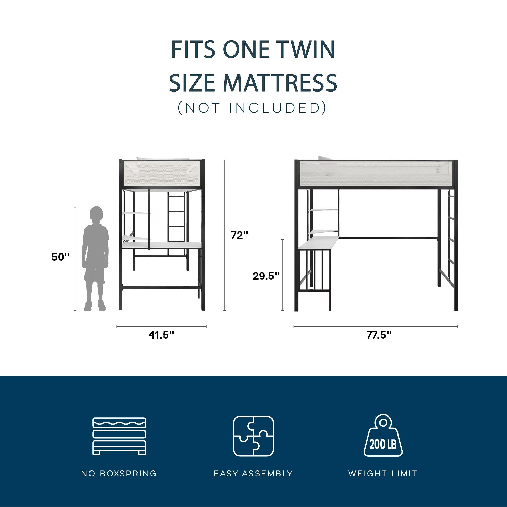 - SPACE SAVING BED: Twin size: 77.5"L x 41.5"W x 72"H. Weight limit: 200 lbs. Desk dimensions: 40.5"W x 15.5"D x 29.5"H. Desk weight limit: 70 lbs. Shelf dimensions: 15"W x 15"D. Shelf weight limit: 50 lbs. Net weight: 96 lbs.