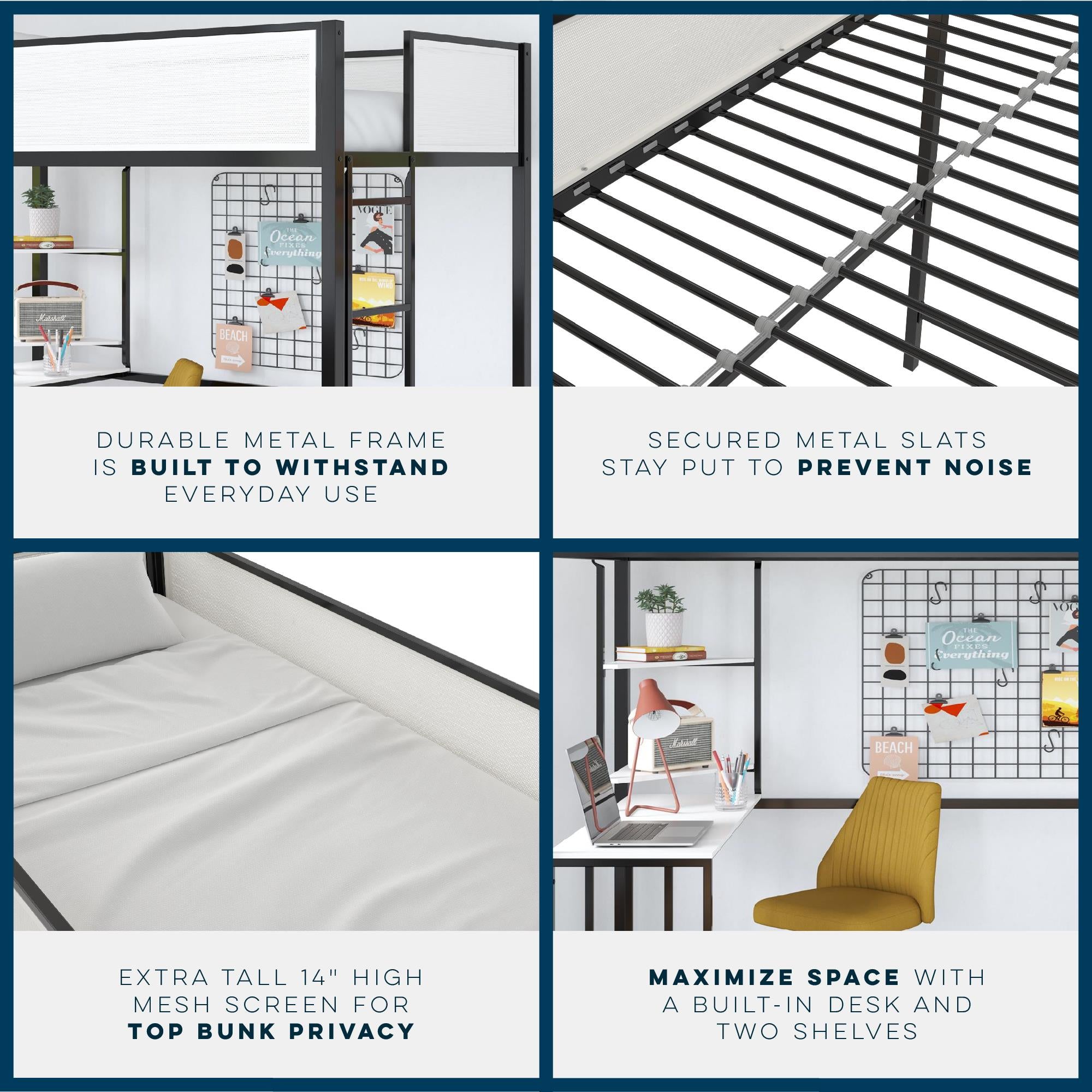 - SUPERIOR SAFETY: Includes a steel bed frame that is powder-coated for corrosion and rust protection, engineered wood shelving, secured metal slats tailored for a 6" mattress, and 14" upper bunk privacy mesh panels that serve as full-length guardrails