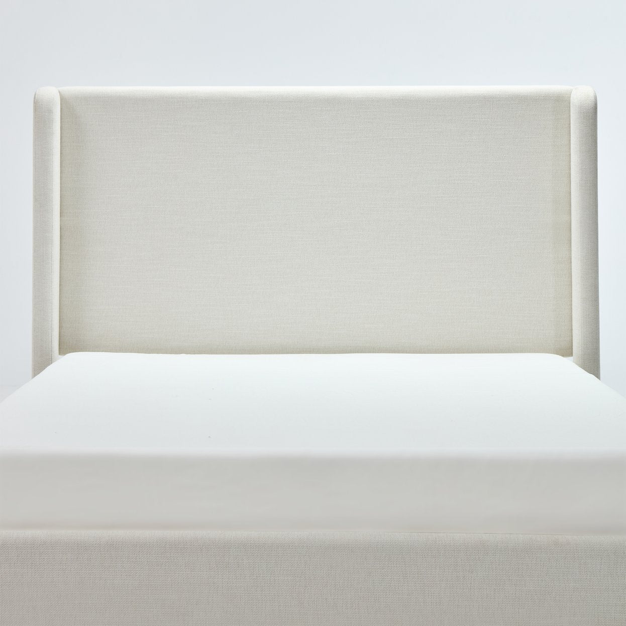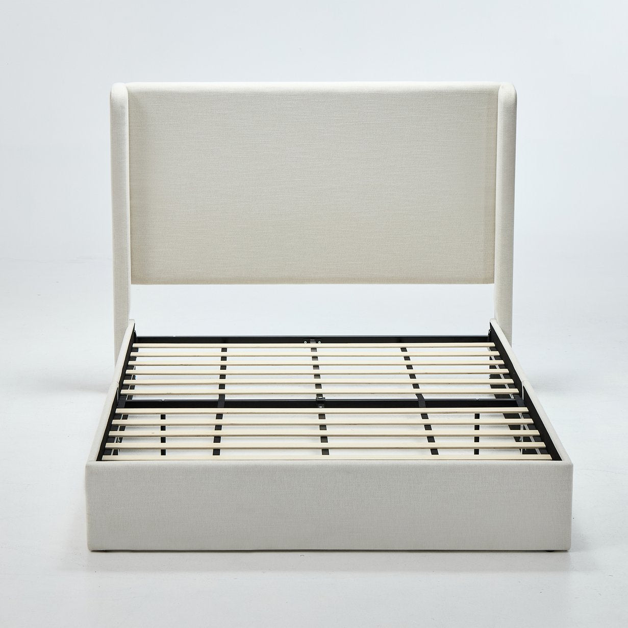 Elevate your bedroom with a modern, minimalist upholstered platform bed that blends designer aesthetics with everyday comfort. The high, curved wingback headboard and textured ivory canvas chenille upholstery create a welcoming focal point, while a sturdy slatted base and metal side rails deliver quiet, reliable support—no box spring required.