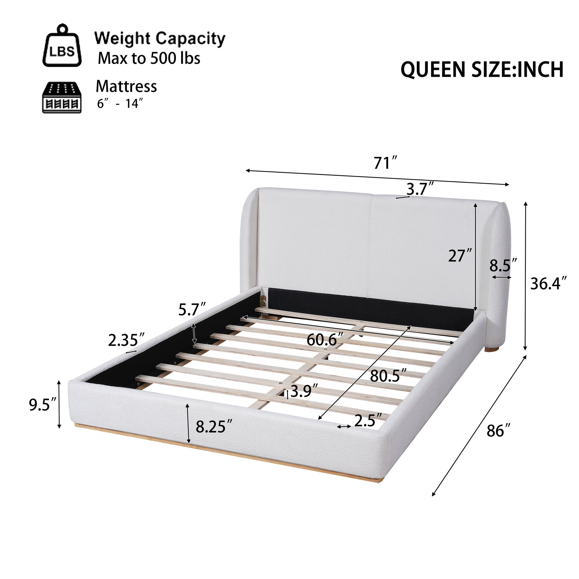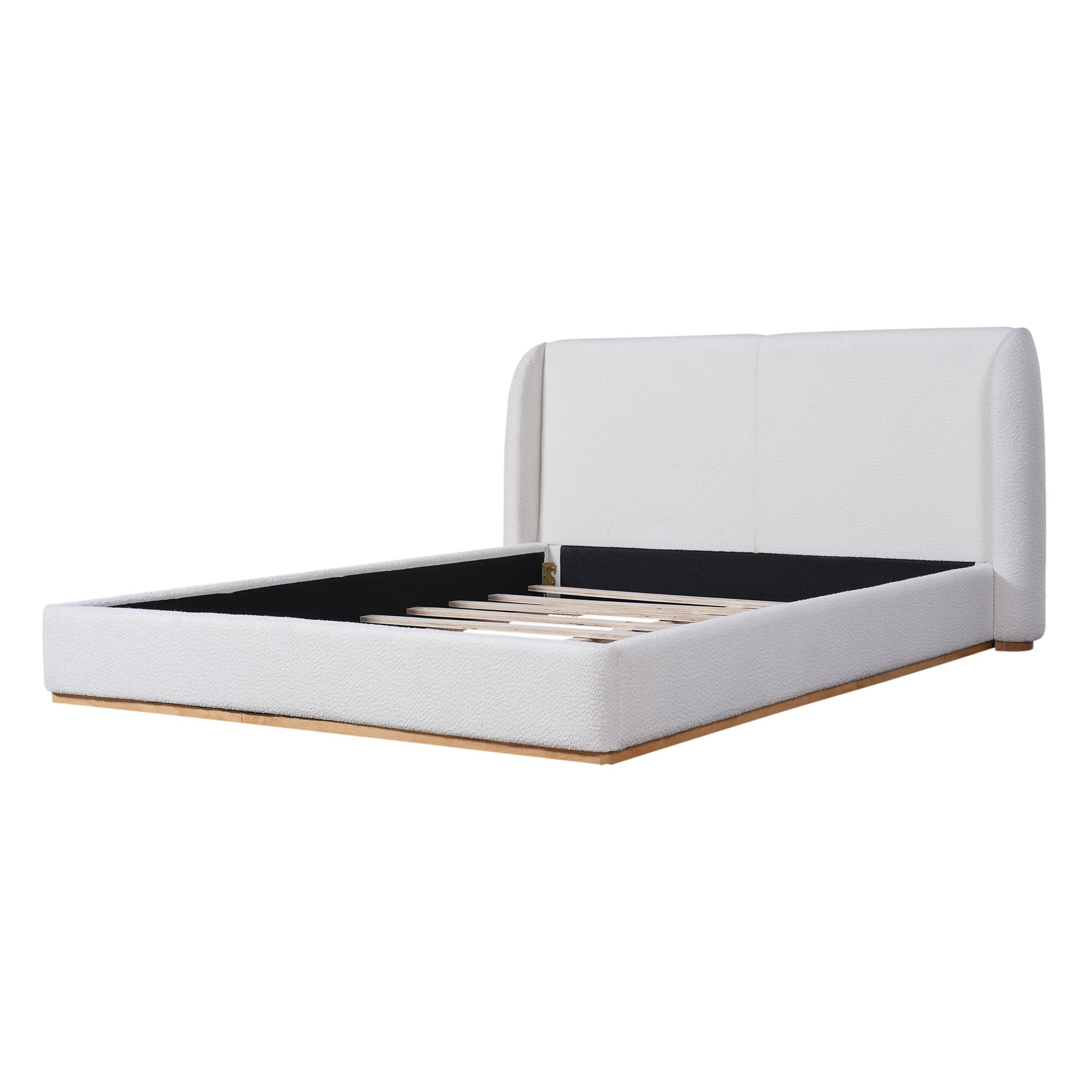 Give your bedroom a modern, cozy upgrade with this queen bed frame featuring a boucle-upholstered wingback headboard and a sturdy solid wood base. The design blends soft, rounded winged sides with a streamlined footboard for an inviting silhouette that anchors both contemporary and transitional interiors. Built for comfort and durability, it supports a mattress without a box spring and arrives ready for straightforward assembly.