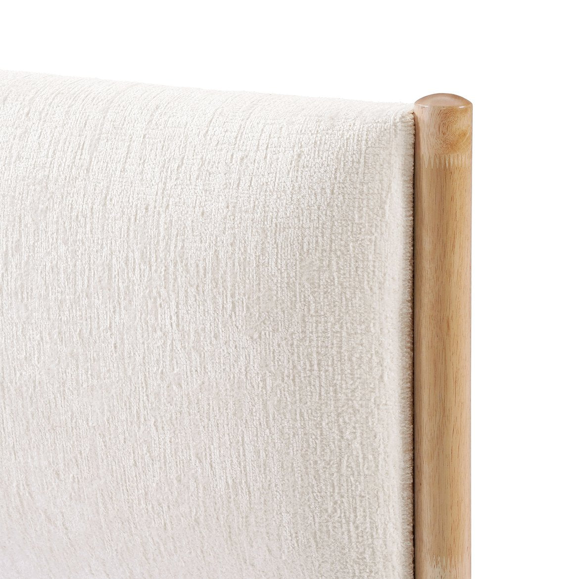 - Materials: Natural wood frame with a white upholstered fabric headboard for a warm yet refined look