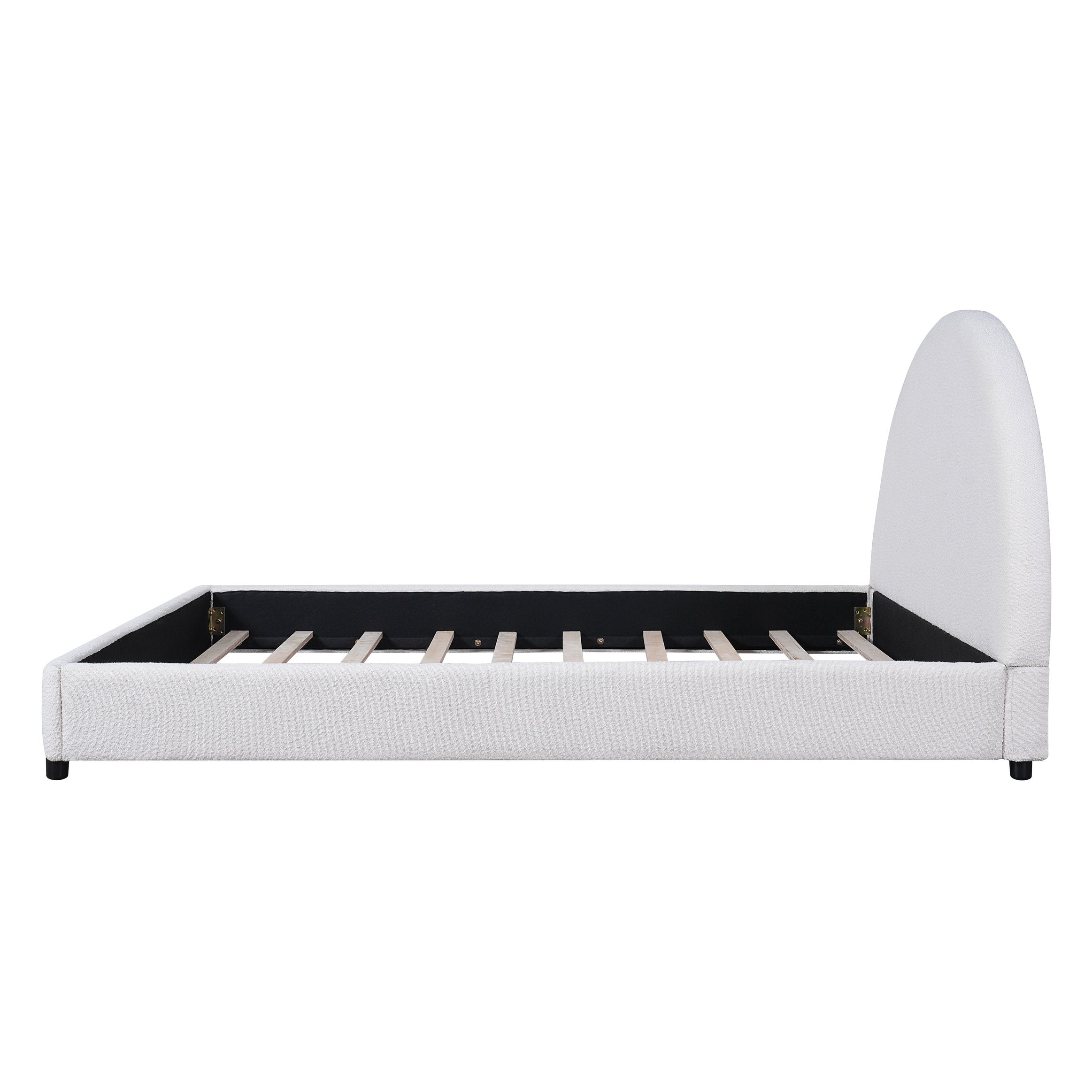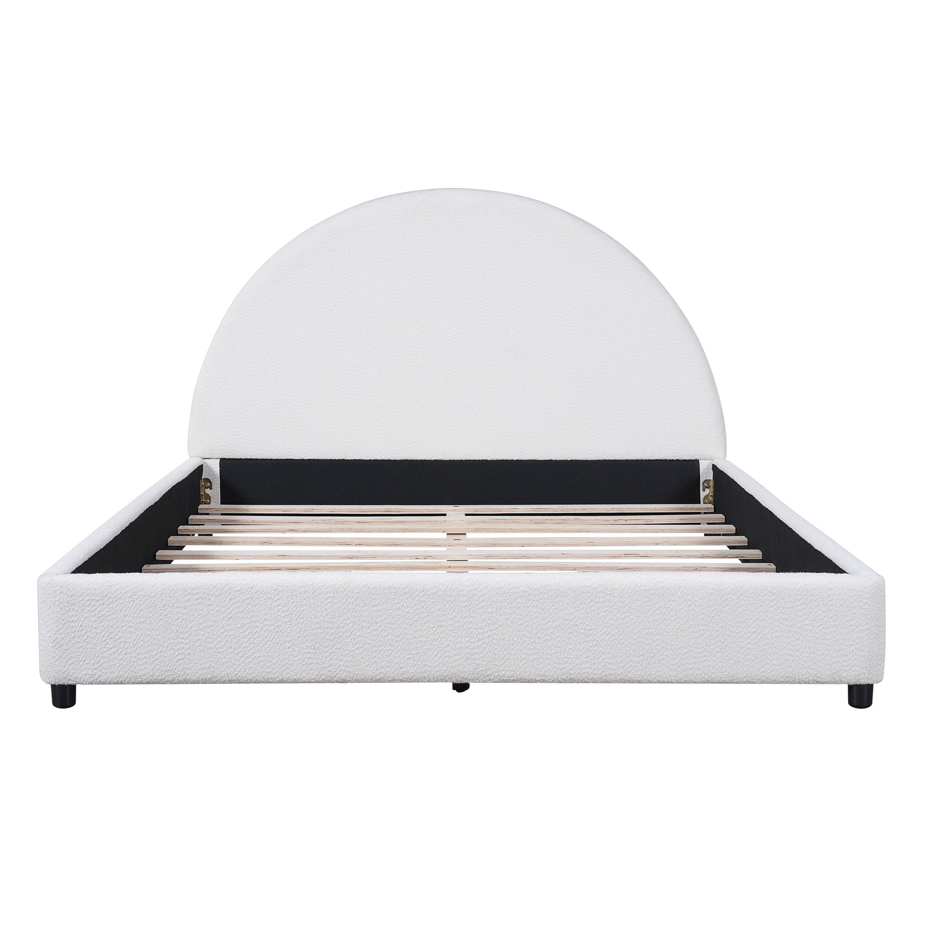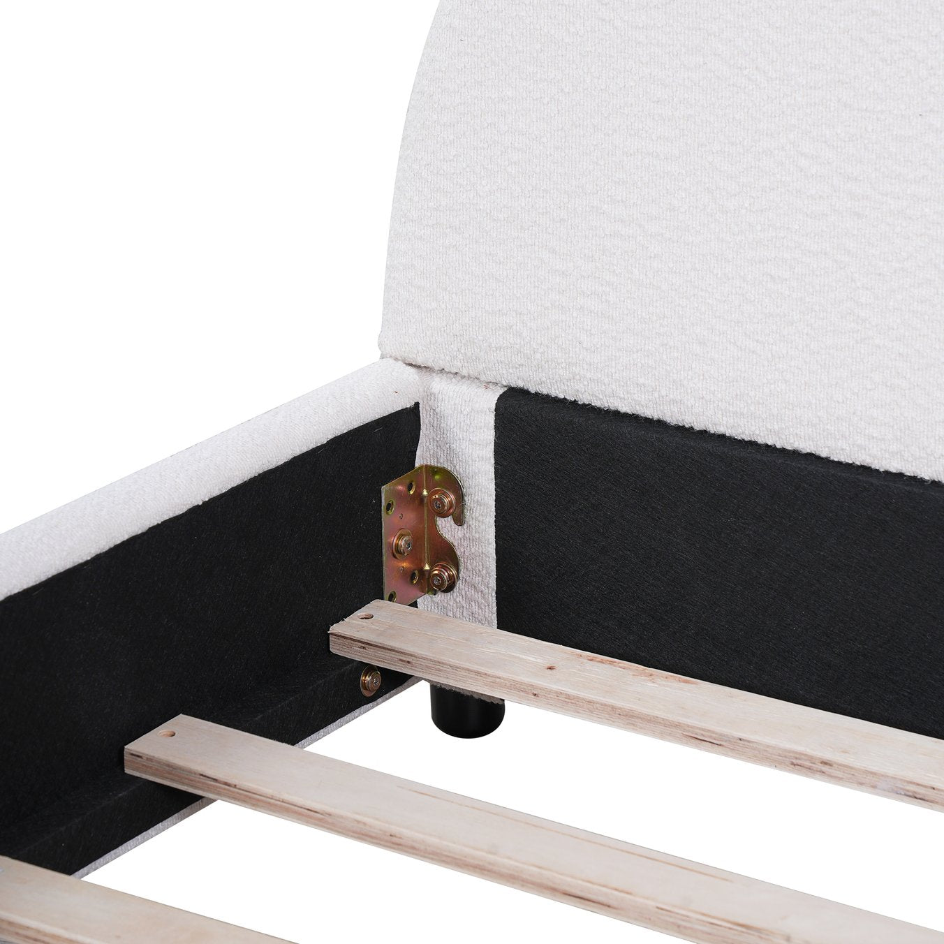 Elevate your bedroom with this elegant queen bed frame featuring a rounded, boucle-upholstered headboard that blends modern comfort with timeless style. The plush, curved silhouette and tactile boucle fabric create a cozy focal point while supportive slats eliminate the need for a box spring, offering a streamlined look and reliable performance for everyday use.
