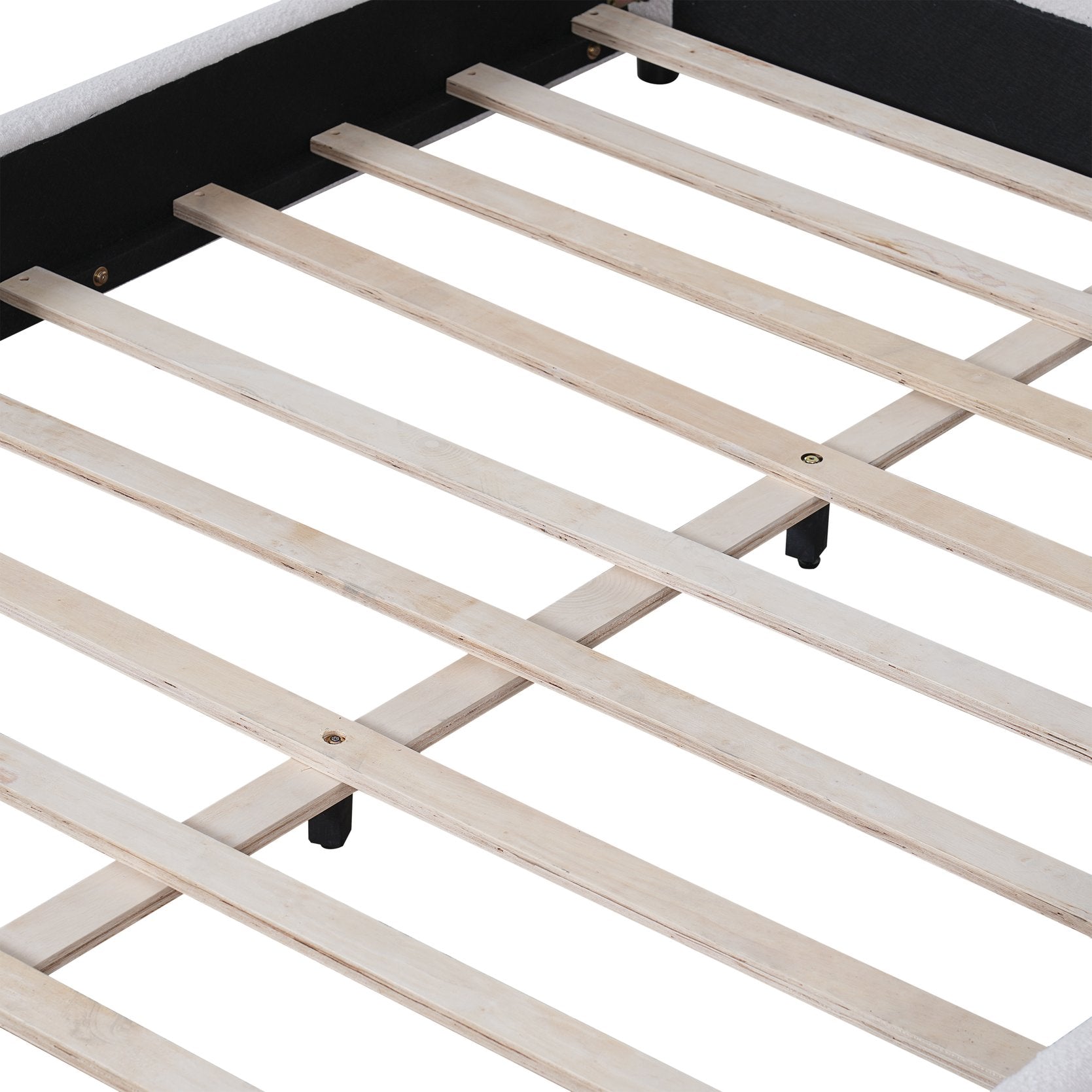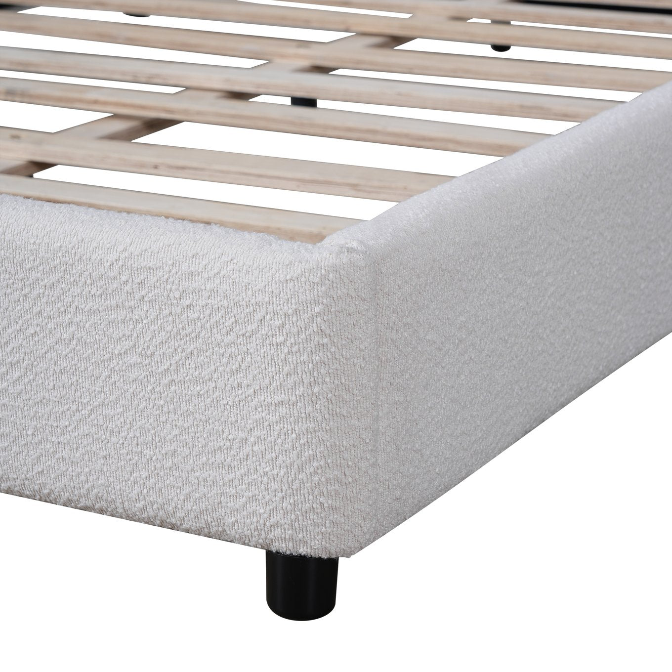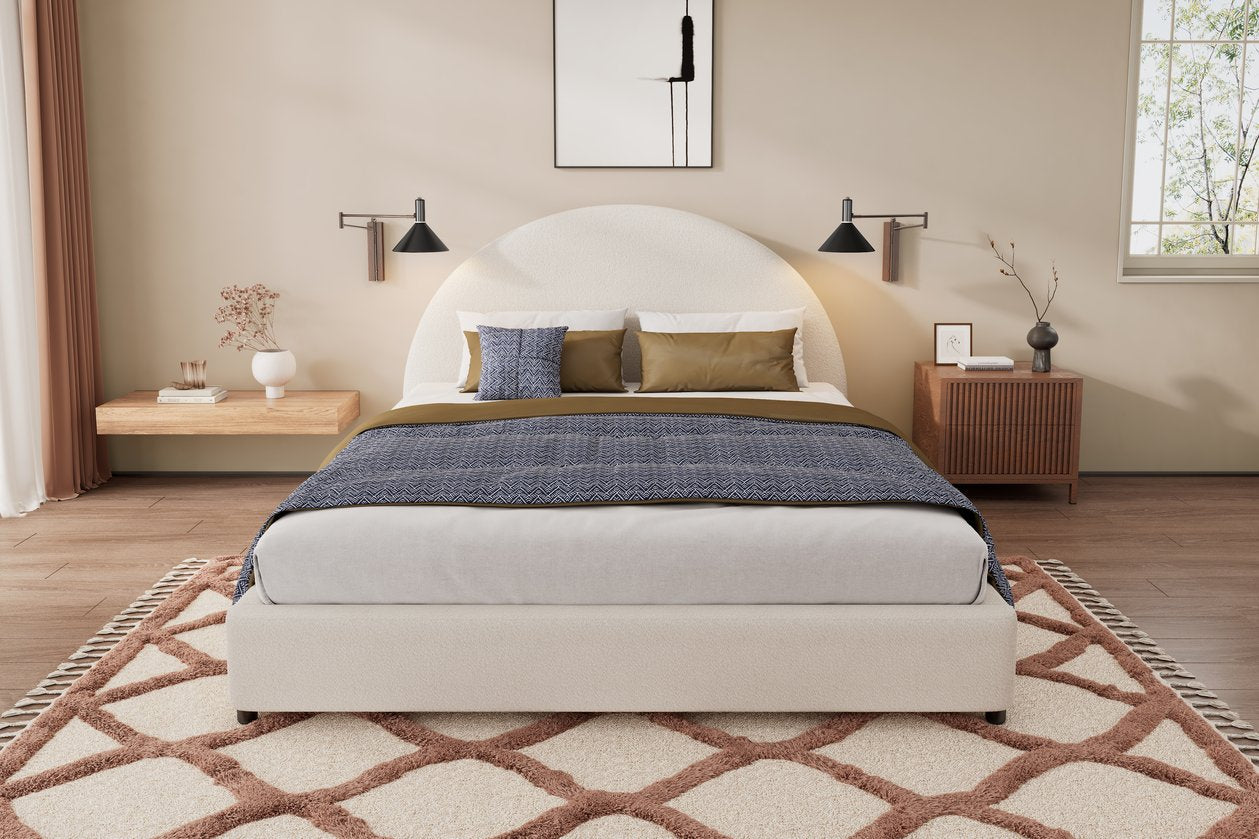 Elevate your bedroom with this elegant queen bed frame featuring a rounded, boucle-upholstered headboard that blends modern comfort with timeless style. The plush, curved silhouette and tactile boucle fabric create a cozy focal point while supportive slats eliminate the need for a box spring, offering a streamlined look and reliable performance for everyday use.
