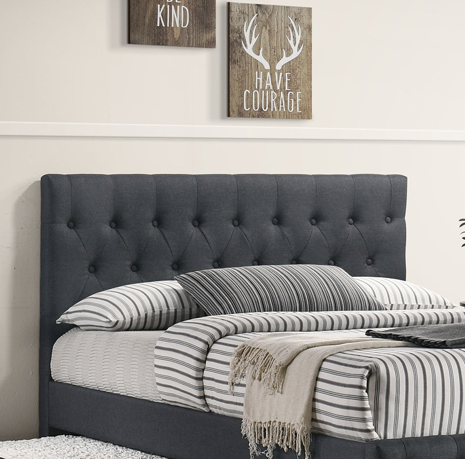 - Upholstery: Charcoal burlap fabric with button-tufted headboard and footboard for a contemporary, tailored appearance.