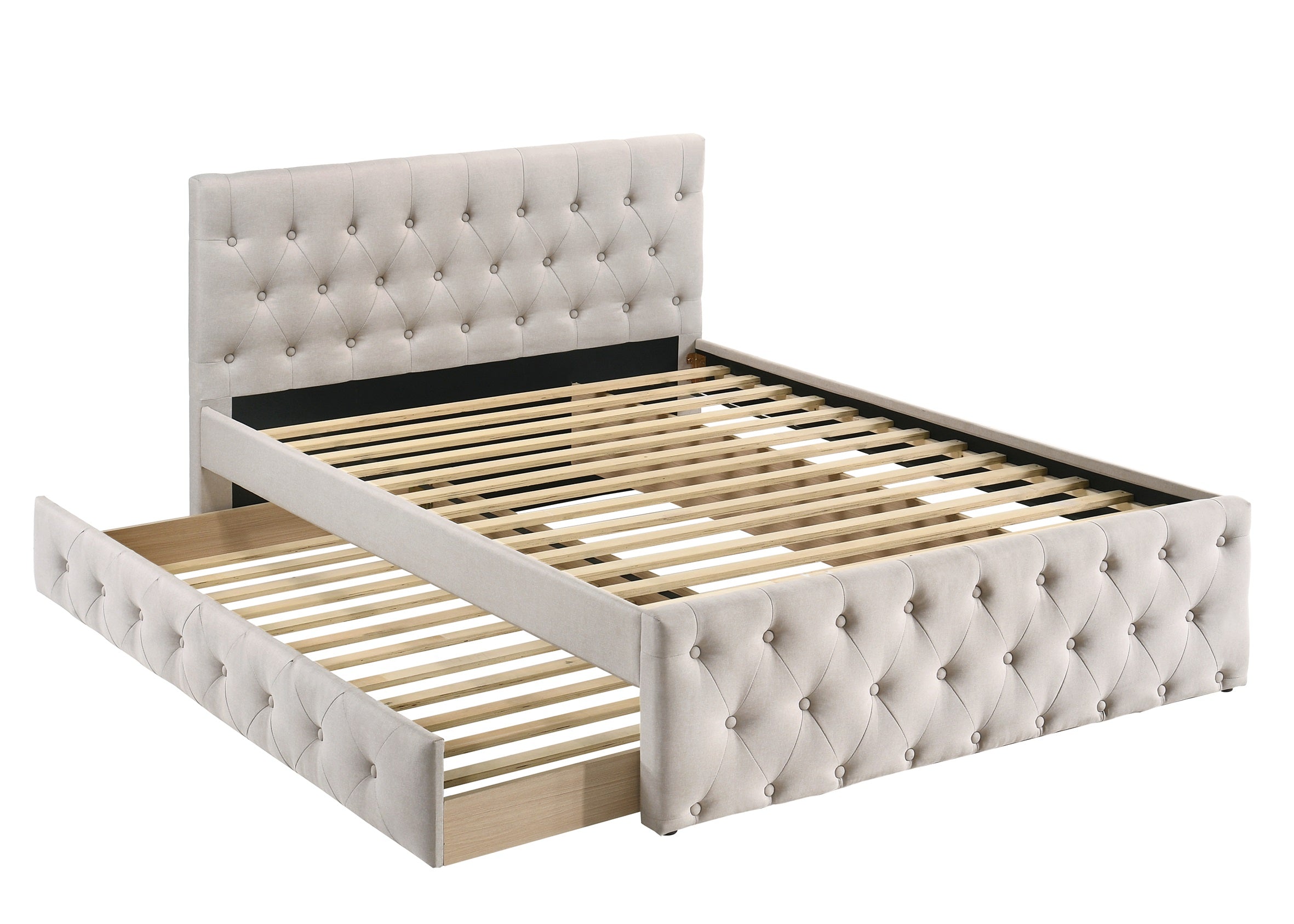 Give your child's room a smart, space-saving upgrade with this contemporary full-size bed featuring a twin trundle. Designed for versatility, the upholstered tufted headboard and matching footboard combine modern style with practical function — the trundle offers a convenient sleep solution for guests or extra storage when not in use. Solid wooden slats provide reliable mattress support and airflow, making this bed both comfortable and durable for everyday use.