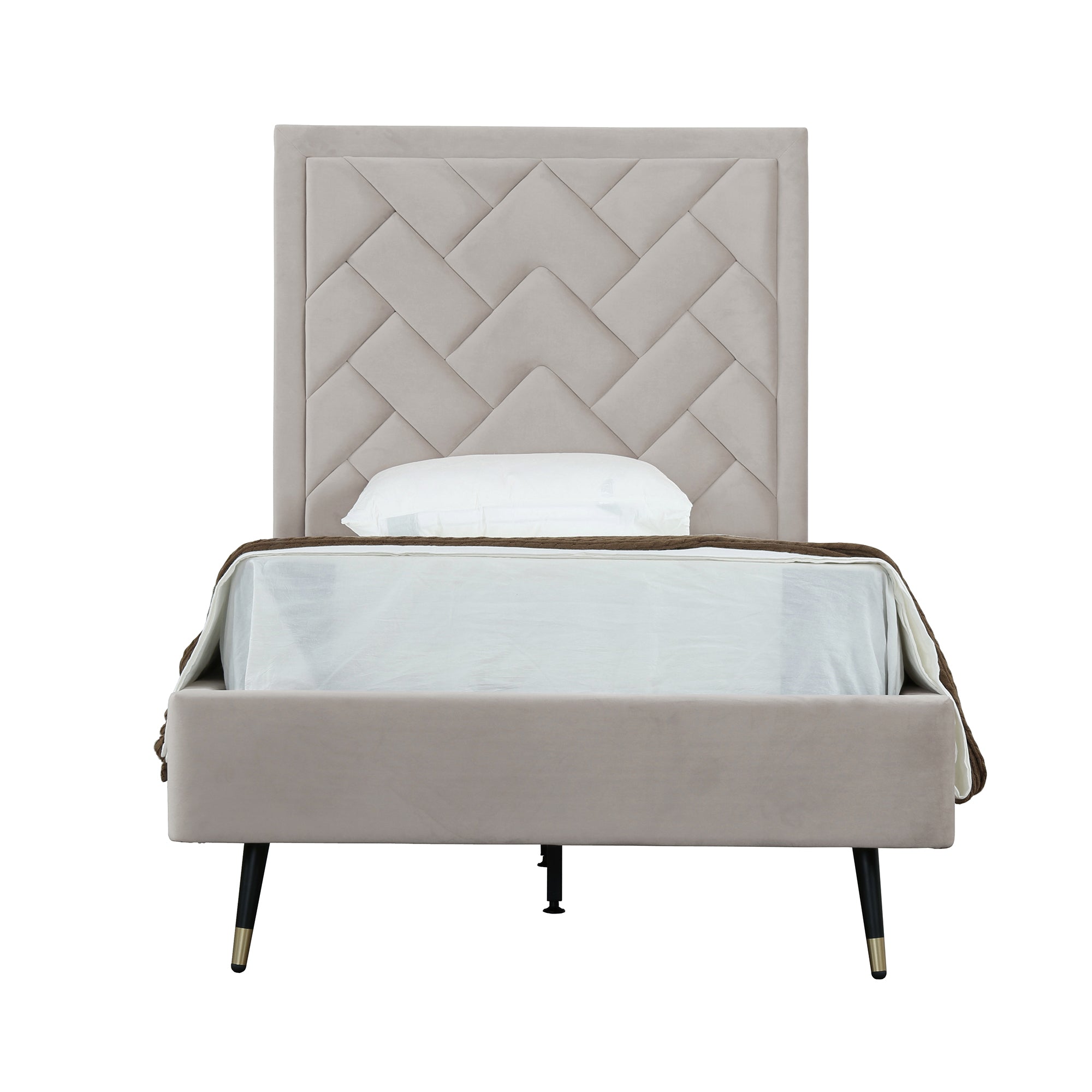 Elevate your bedroom with the Crosby upholstered velvet twin bed in a versatile greige tone. This refined bed combines plush comfort, modern tailoring, and sturdy construction to create a stylish centerpiece for a child's room, guest room, or compact master. Easy to assemble with all hardware included, it delivers immediate comfort without the need for a box spring.