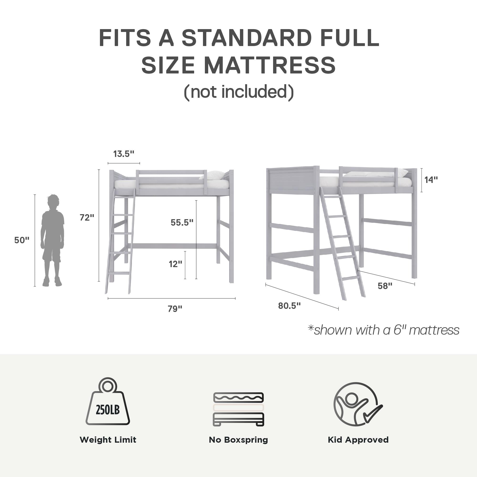 - Full-size loft design elevates the mattress to free up usable floor area for furniture or activities underneath