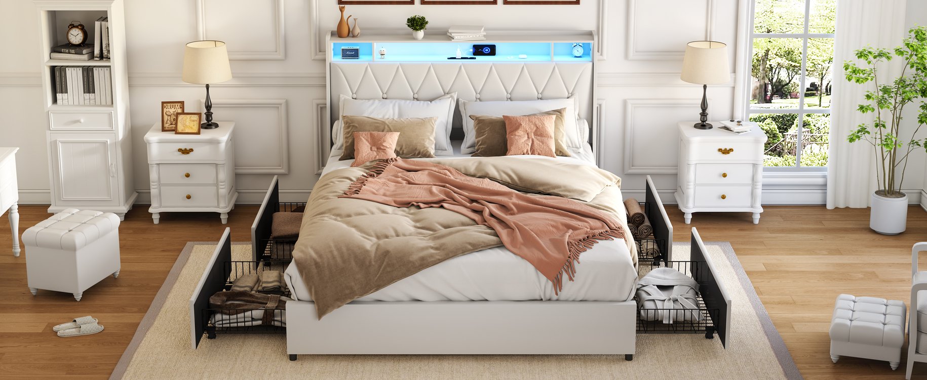 - Integrated Power & Charging: Built-in outlets and USB charger located in the headboard area for convenient device charging and bedside power access.