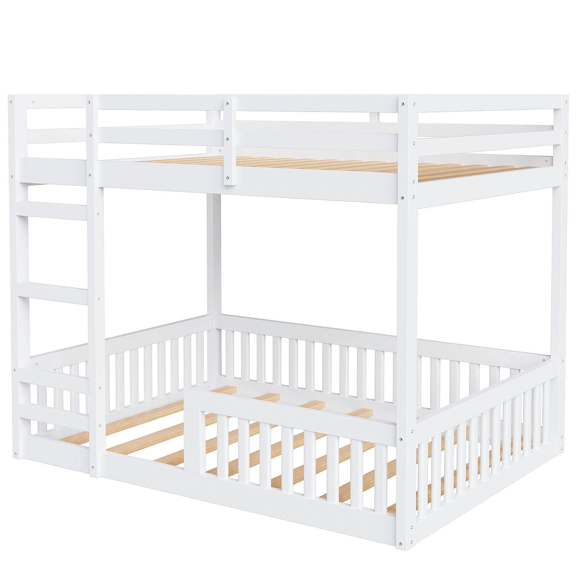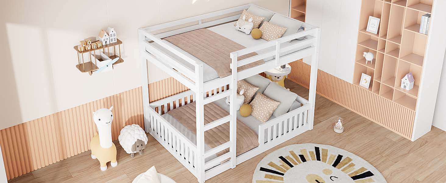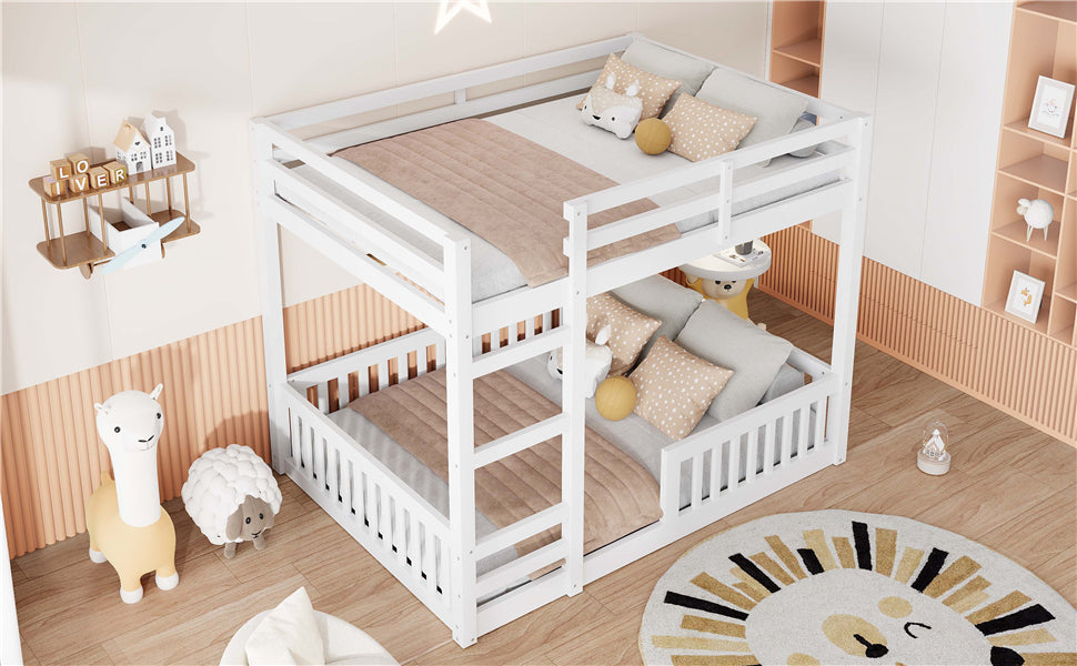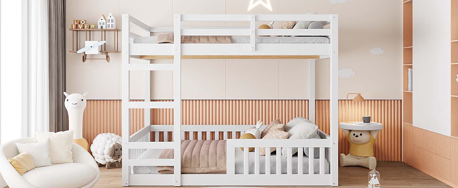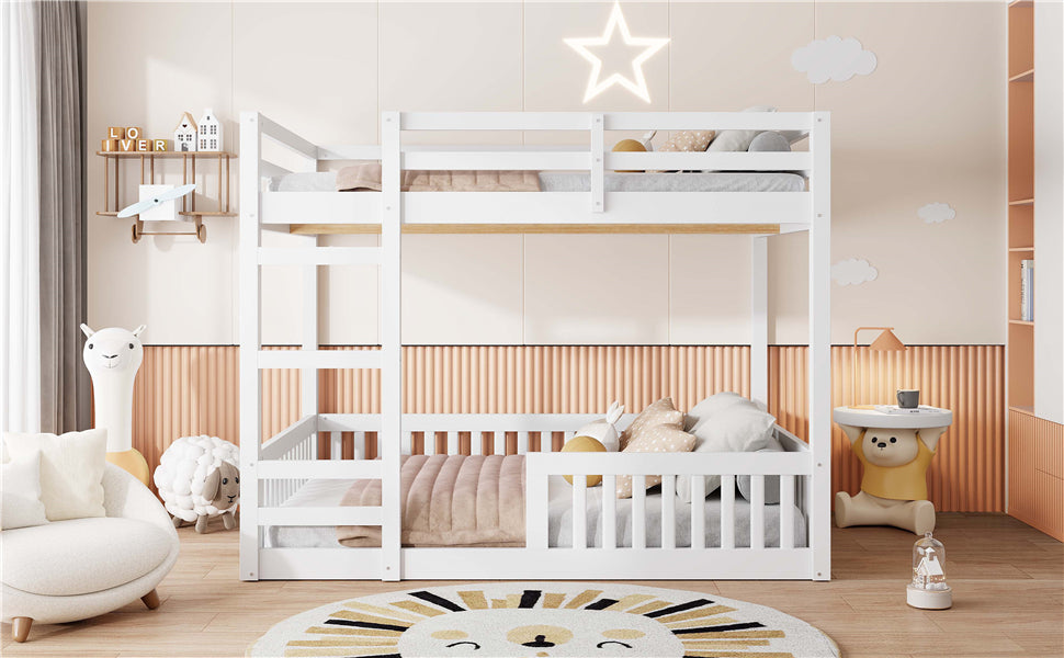 - Design: Classic white finish with built-in ladder and full-length guardrails on the top bunk for easy access and added safety.