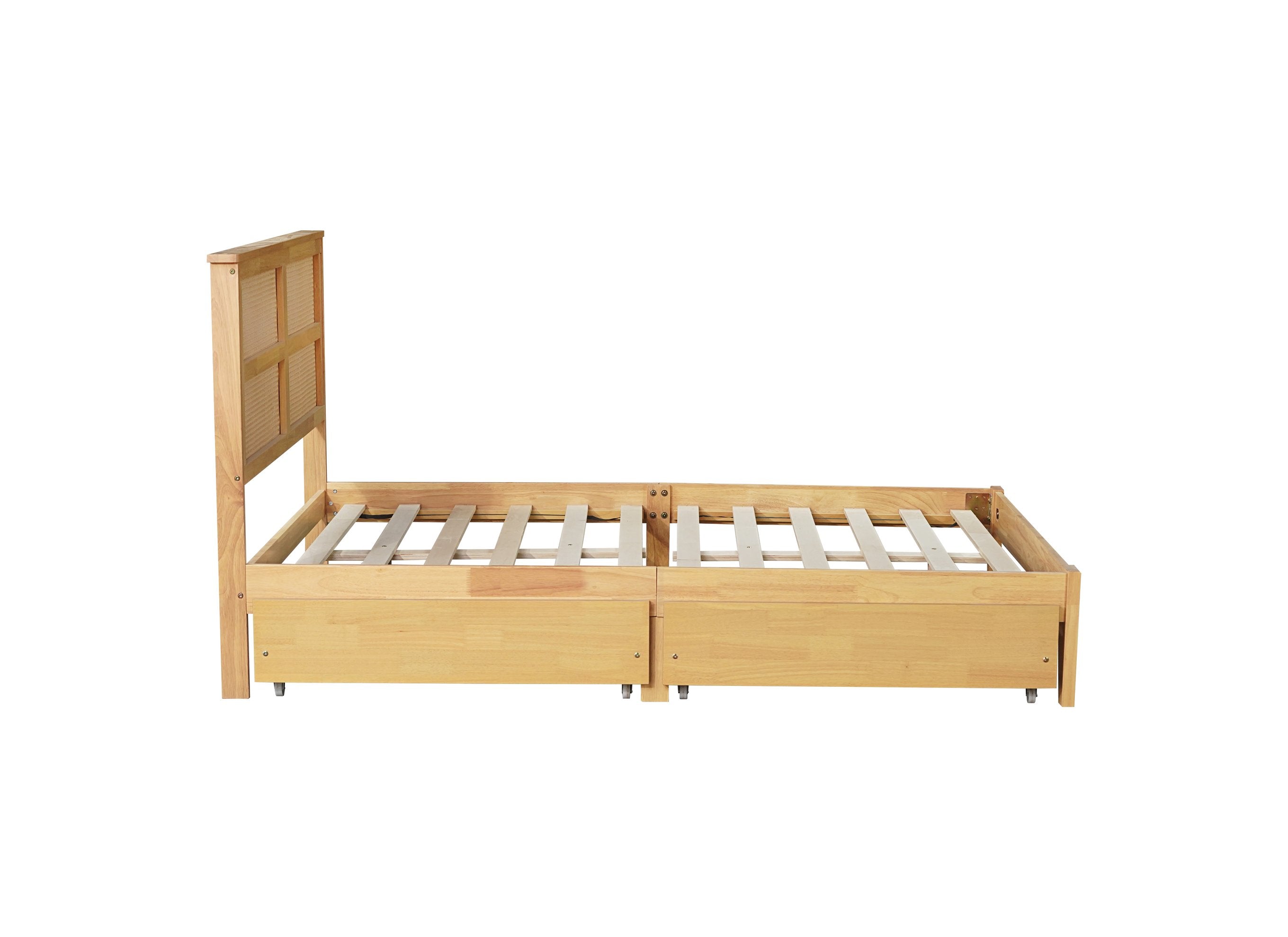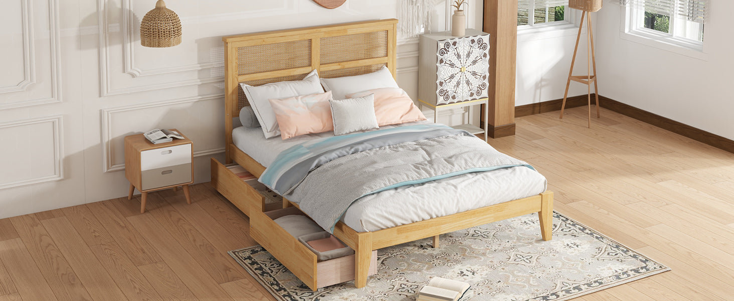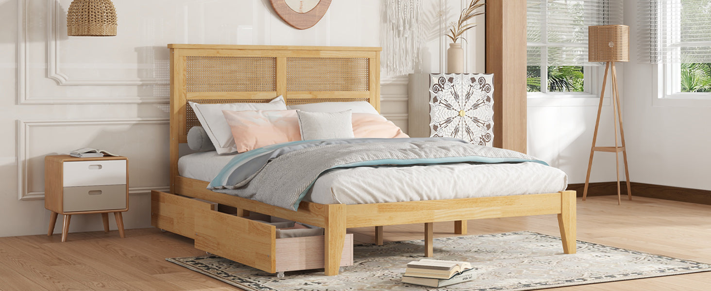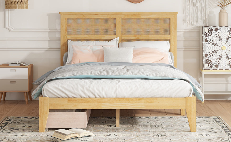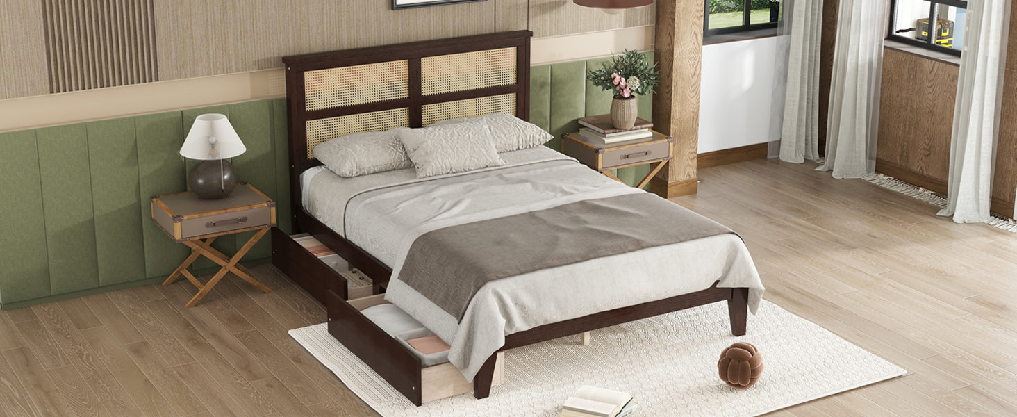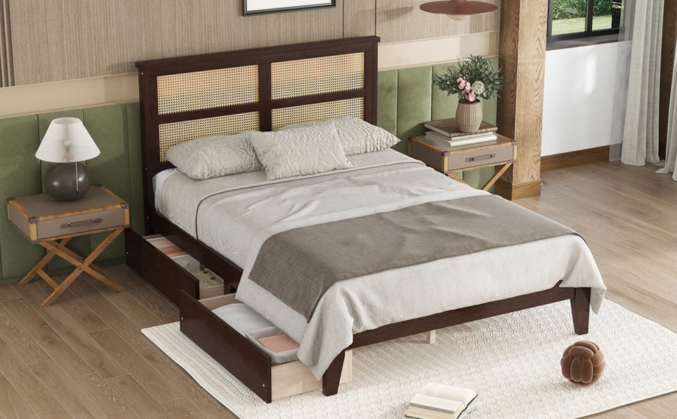 Bring natural texture and smart storage to your bedroom with this full-size platform bed featuring a woven rattan headboard, two built-in drawers, and sturdy rubberwood construction. Thoughtfully designed for everyday comfort and efficient use of space, it supports a standard full mattress without the need for a box spring and complements both contemporary and rustic interiors.