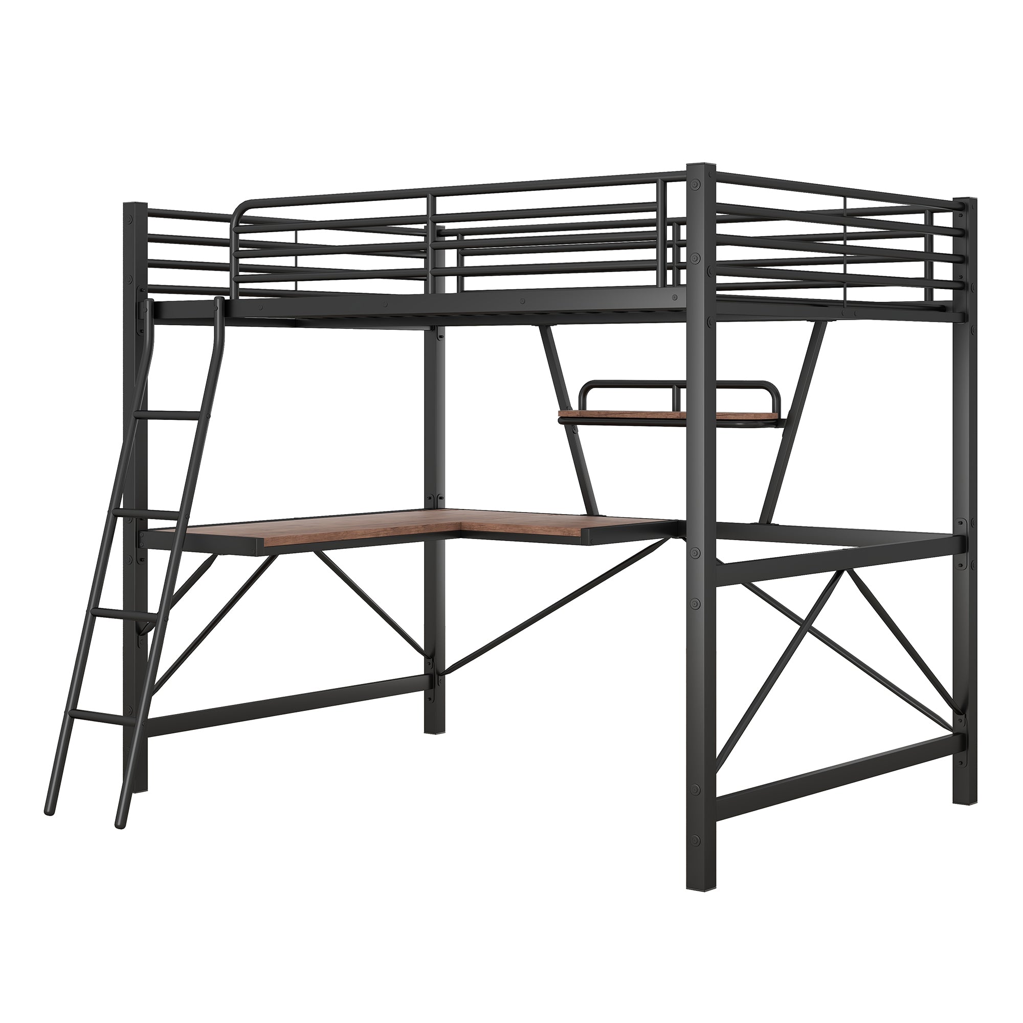 Give your child or teen a sleek, space-saving sleep and study solution with this contemporary full-size loft bed. Designed to maximize floor space while offering a dedicated workspace, the loft integrates a sturdy metal frame with MDF surfaces for durability and modern appeal. The raised sleeping area features full-length protective fencing and a fixed ladder for safe access, while the built-in desk and shelf create a functional study zone ideal for homework, reading, or crafts. Finished in a black powder coat, the bed’s clean lines suit a wide range of room styles and help keep rooms organized and stylish.