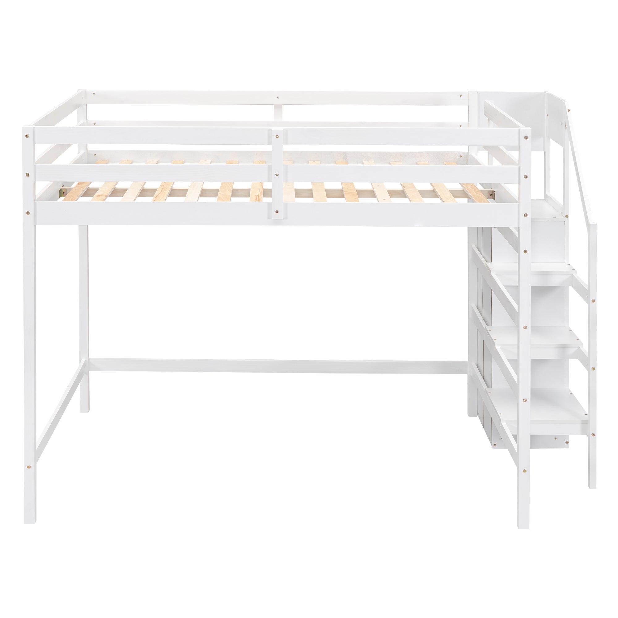 Maximize floor space and stay organized with this stylish full-size loft bed featuring a built-in storage wardrobe and a staircase that doubles as shelving. Designed for functionality and clean modern appeal, the loft creates a private sleeping area above and a versatile storage/wardrobe zone beneath—ideal for small bedrooms, shared rooms, or studio living where every inch counts.