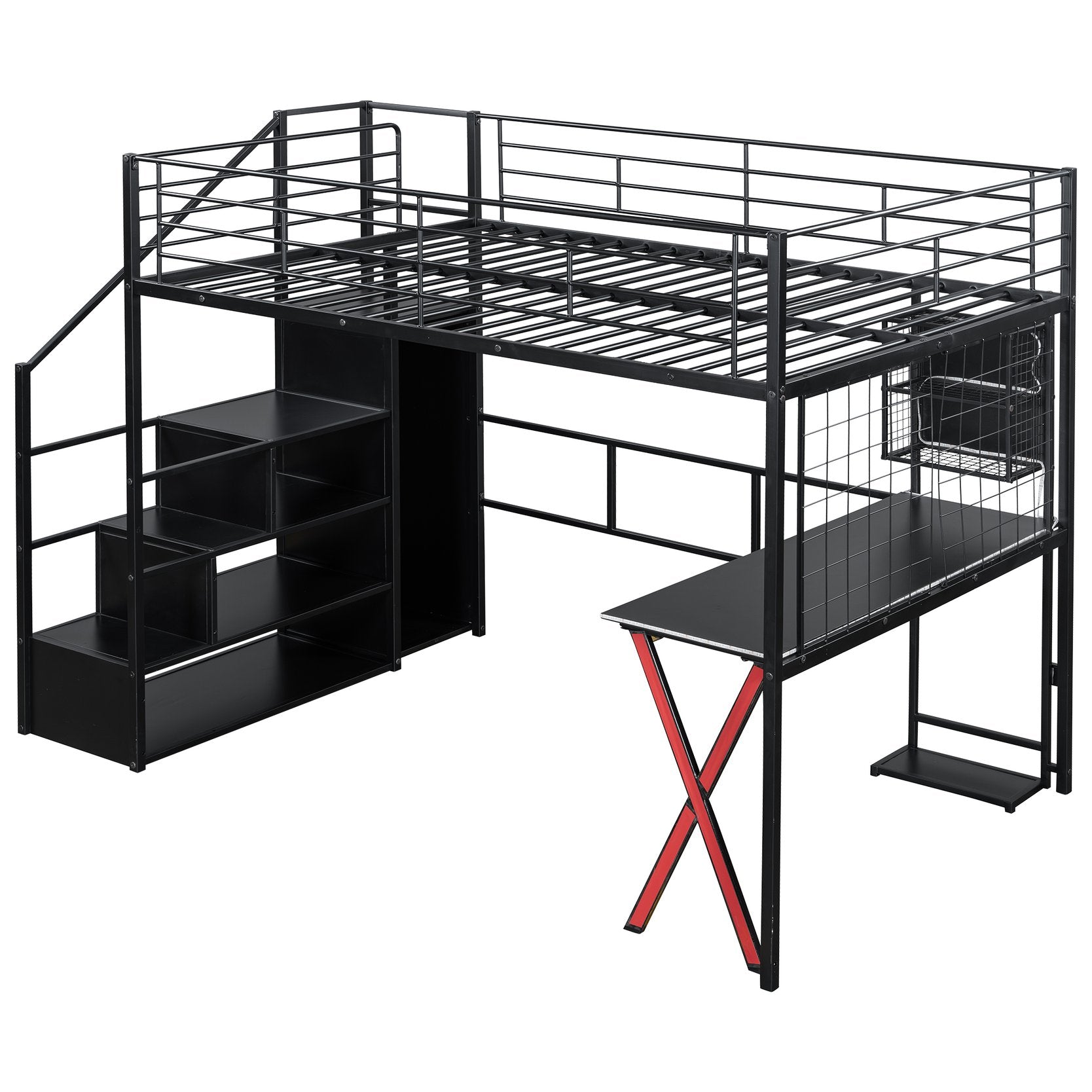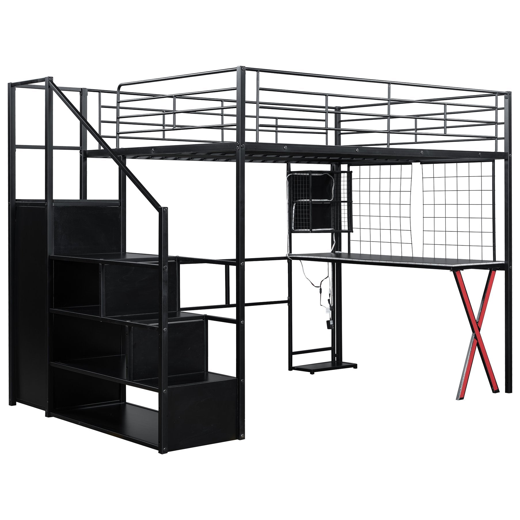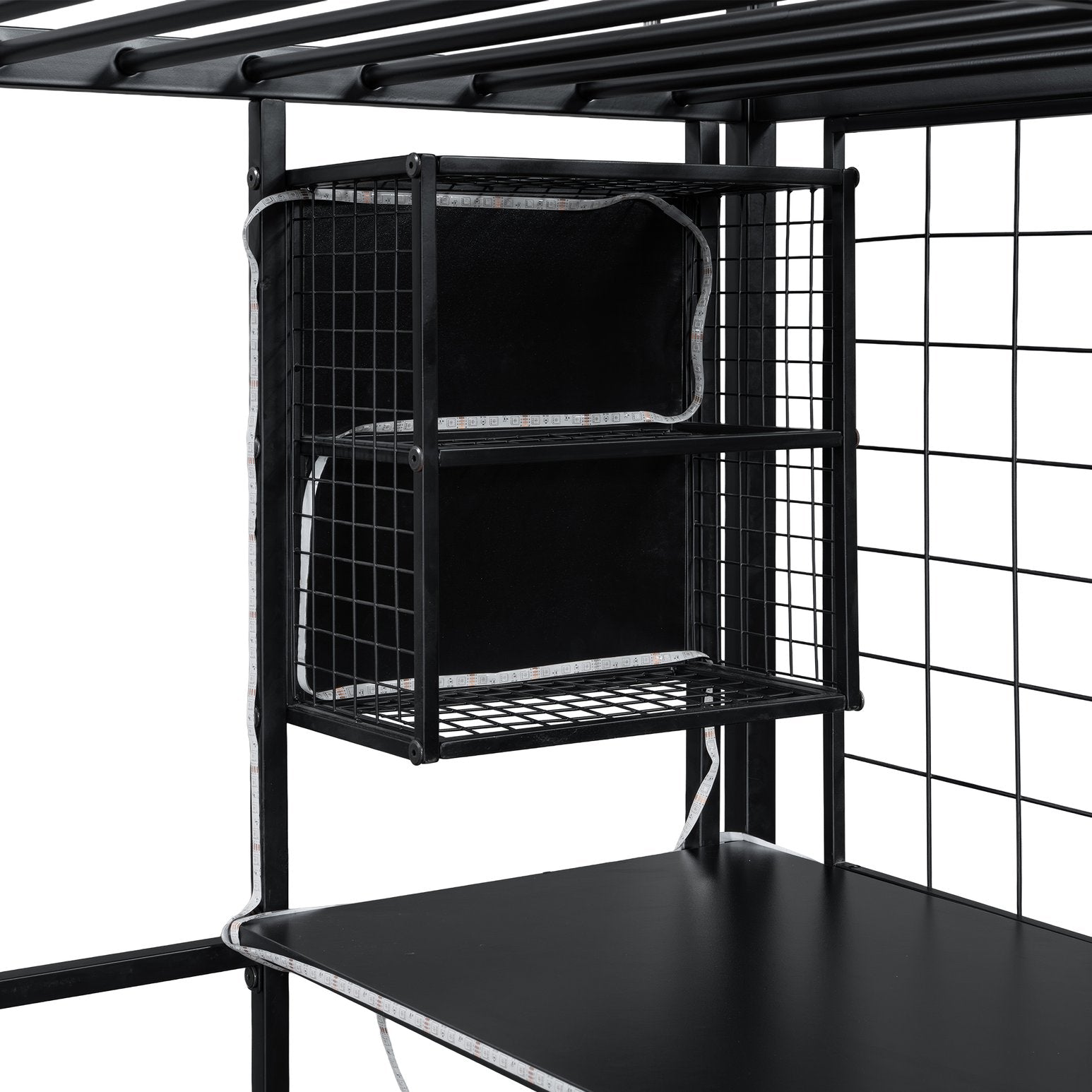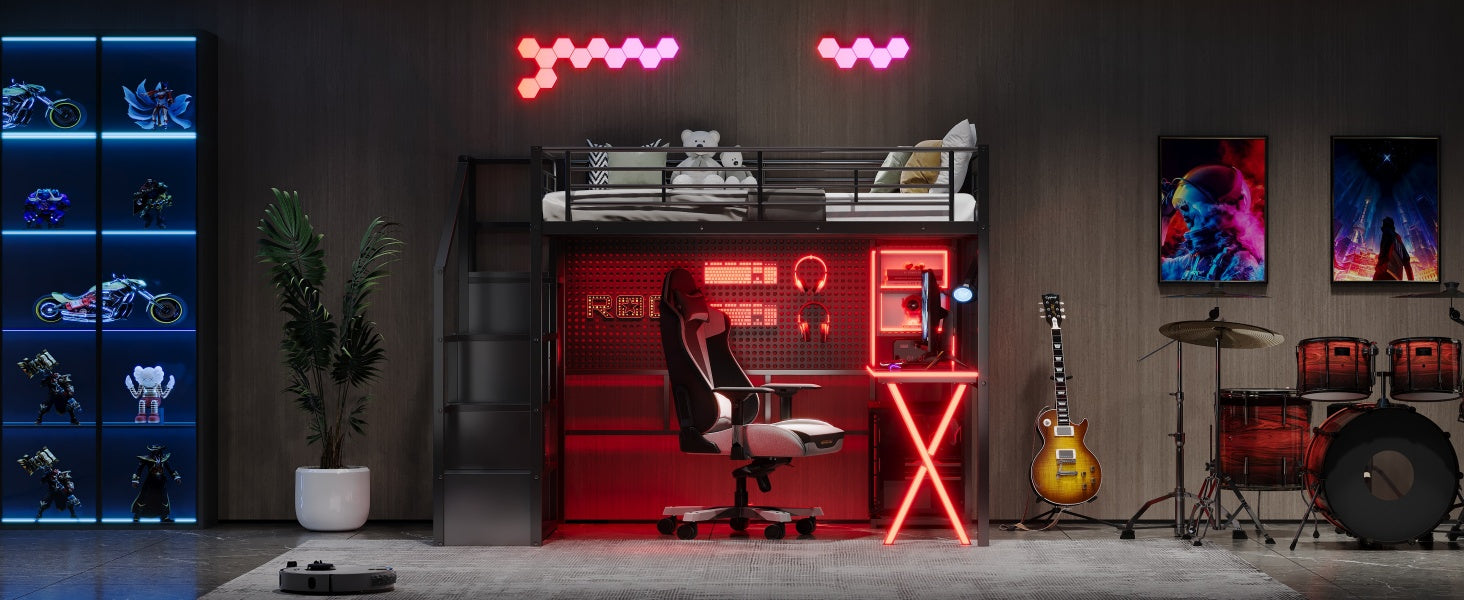 - [LED Workstation] This loft bed includes a built-in desk, 2 storage shelves and 1 computer host shelf and 2 grid boards. With the LED light strips on the X-shaped table legs and the edges of desks and shelves, you can turn the underspace into a clever workstation, a reading nook or a craft area.