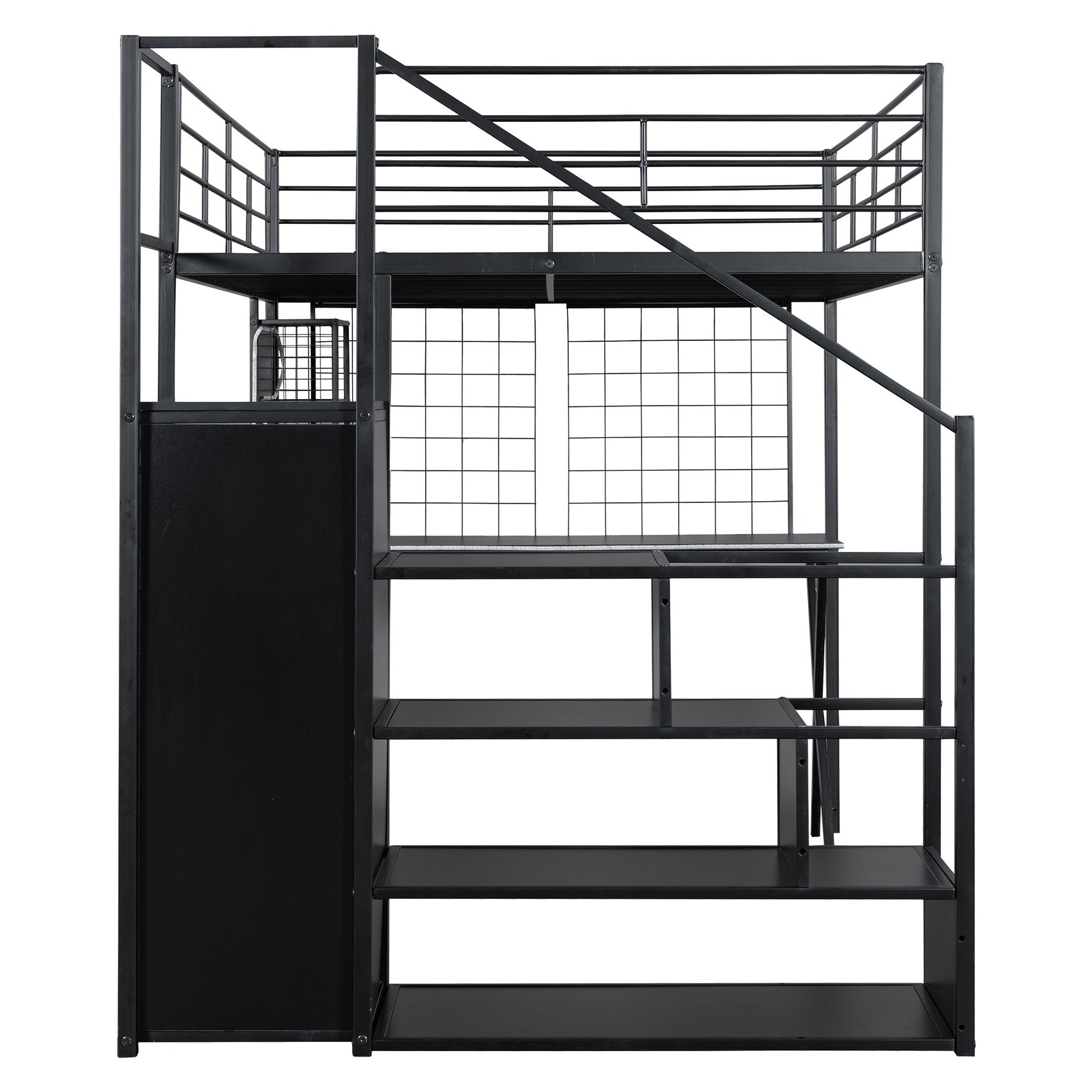 Transform a child's bedroom into a smart, space-saving haven with this all-in-one full-size loft bed. Combining a sturdy metal frame with practical MDF accents, it integrates a built-in workstation, wardrobe, and storage staircase—complete with LED lighting—so sleeping, studying, and storing are organized and stylish in one footprint. Designed for safety and everyday use, the loft bed features full-length guardrails, a secure ladder, and reinforced slats for stability.