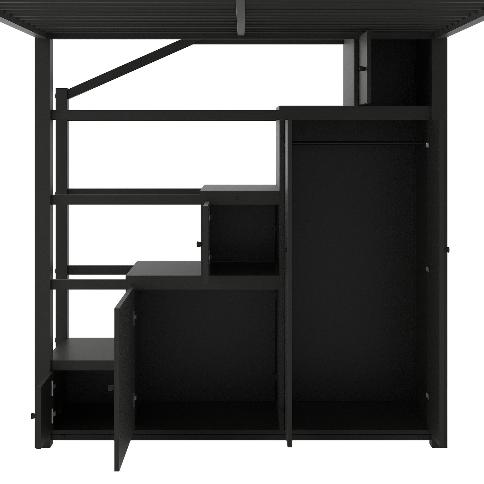 Transform your bedroom into a versatile, space-saving retreat with this full-size metal loft bed. Its clean-lined black finish and slatted head/footboard provide a modern industrial look, while the integrated storage shelves, cabinets, wardrobe and staircase maximize functionality — perfect for small rooms, dorms, or studio apartments that need both sleeping and storage solutions.