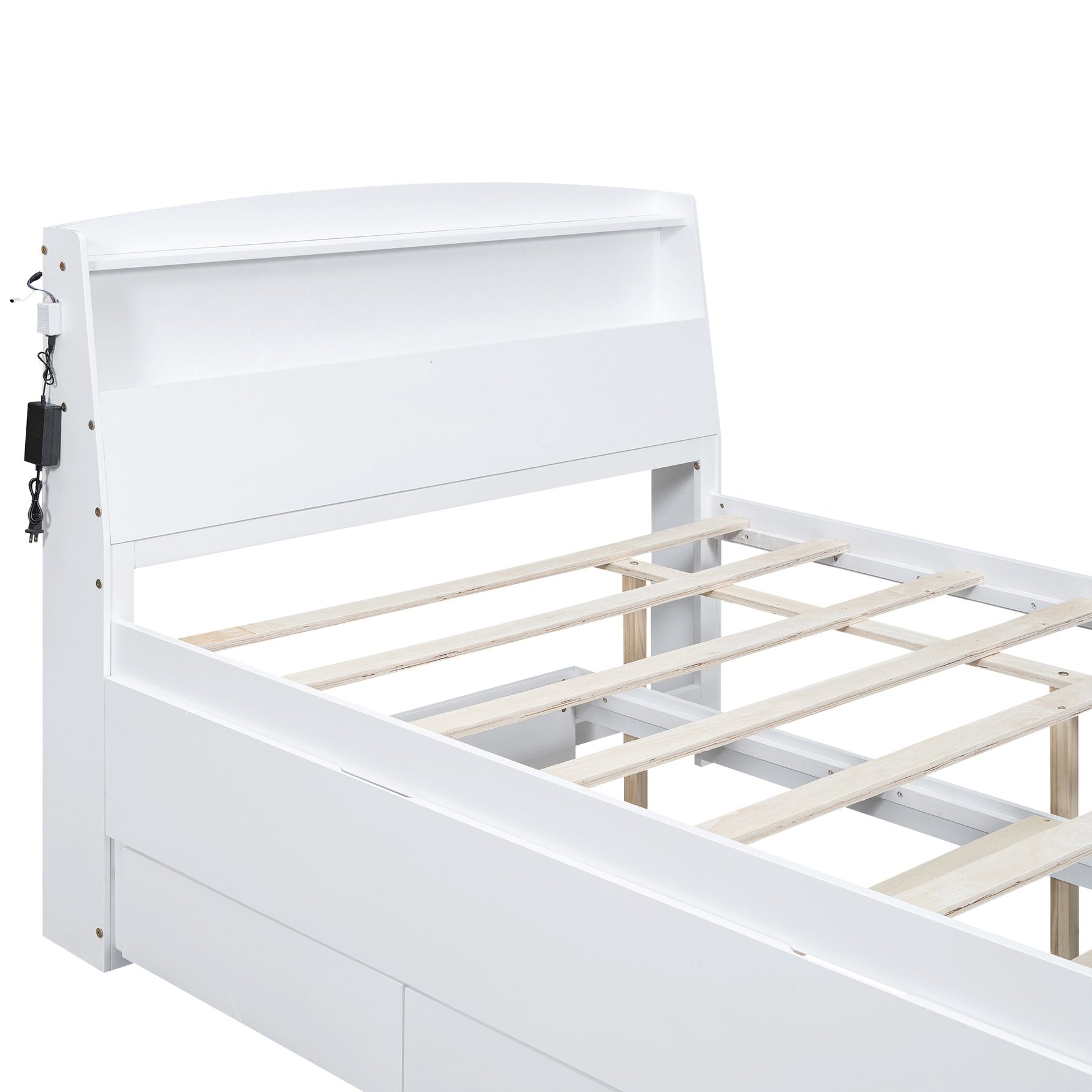 Upgrade your bedroom with a modern, space-saving platform bed that blends clean design with smart storage and ambient lighting. This white full-size bed features a built-in LED headboard, a convenient twin-size trundle, and three smooth-gliding drawers — all crafted from solid pine and MDF for lasting durability. Ideal for small spaces, guest rooms, or kid’s rooms, this bed keeps essentials organized while offering flexible layout options thanks to reversible storage placement.