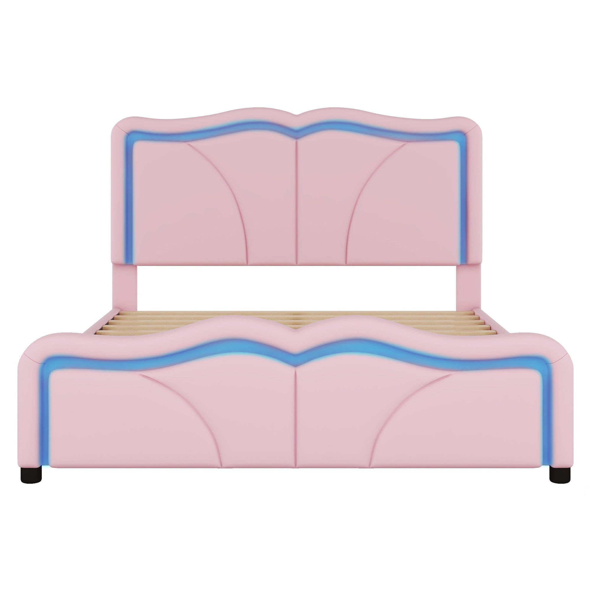 Give your child's bedroom a playful, stylish upgrade with this full-size upholstered platform bed. Its curved, cushioned headboard and soft pink upholstery create a cozy, inviting focal point, while adjustable headboard heights and integrated LED light strips add both function and fun. Built on a sturdy pine and MDF frame with solid wood legs and quality hardware, this bed balances youthful design with long-lasting support.