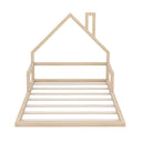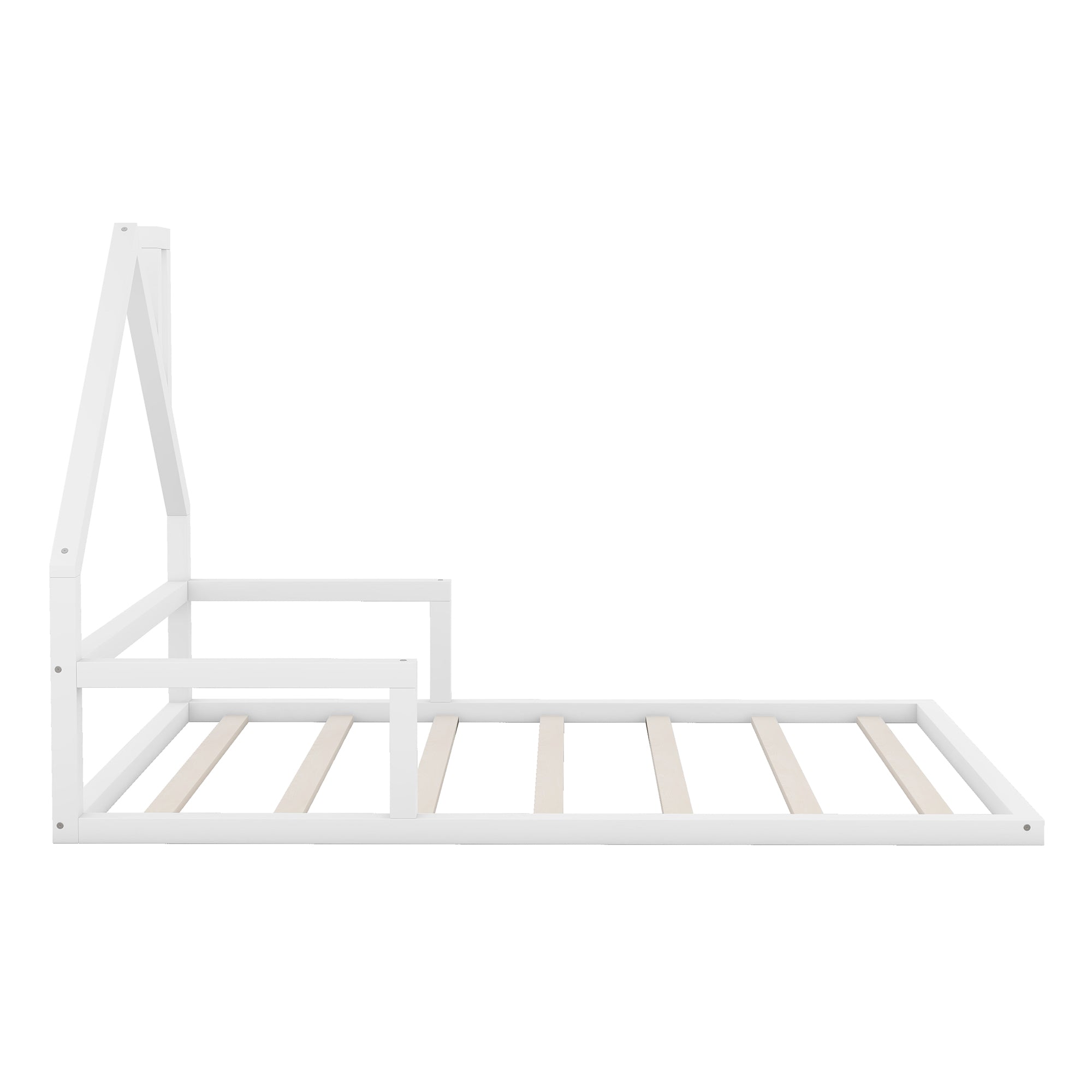 Bring playful charm and clean, modern lines to any bedroom with this full-size floor bed featuring a house-shaped headboard. Crafted from solid pine and MDF with a crisp white finish, the low-profile design creates an open, airy feel while the whimsical headboard adds character—ideal for kid, teen, or minimalist adult bedrooms. The bed ships in one package and requires assembly; it accommodates a standard full mattress (no box spring required).
