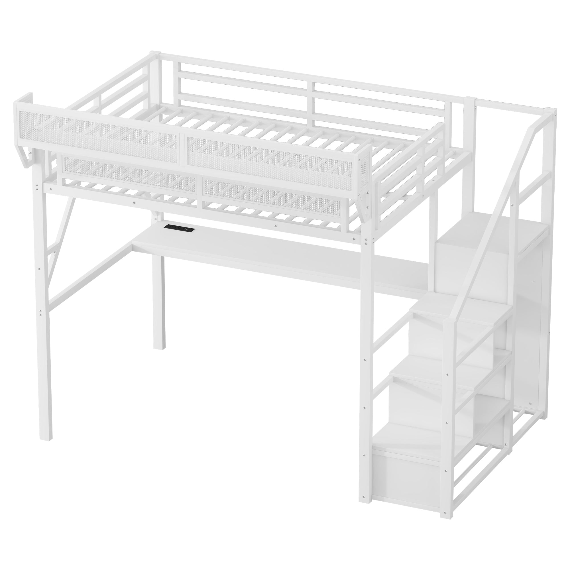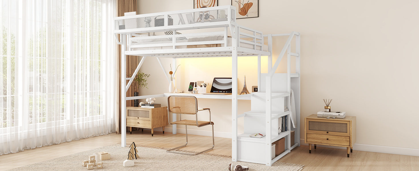 Give your child a smart, space-saving bedroom solution that combines sleeping, studying, and storage in one sturdy unit. This full-size metal loft bed is built for kids and teens who need a functional, stylish setup: a raised sleeping area with protective guardrails, an integrated desk and shelving for homework and organization, a staircase with storage, plus a built-in light and charging station for modern convenience. Durable metal construction and thoughtful design make it a long-lasting centerpiece for a busy room.