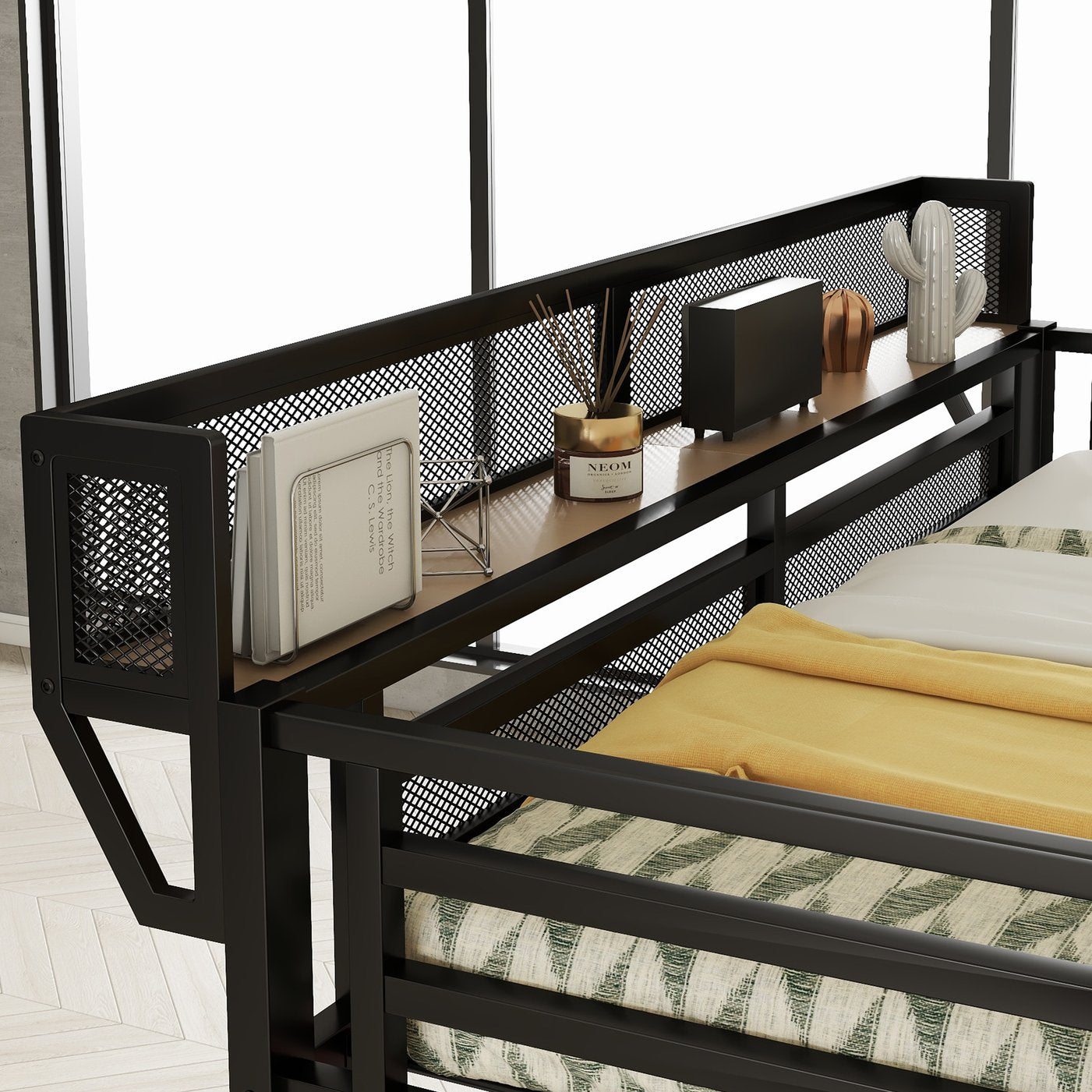 - 【Full Loft Bed with Storage Shelves for Upper】The full metal loft bed features a storage shelf next to the upper bed, providing extra storage space. This shelf is perfect for keeping books, gadgets, or small items within easy reach. The shelf have mesh around which prevent the thing fall down. It adds functionality without compromising space.