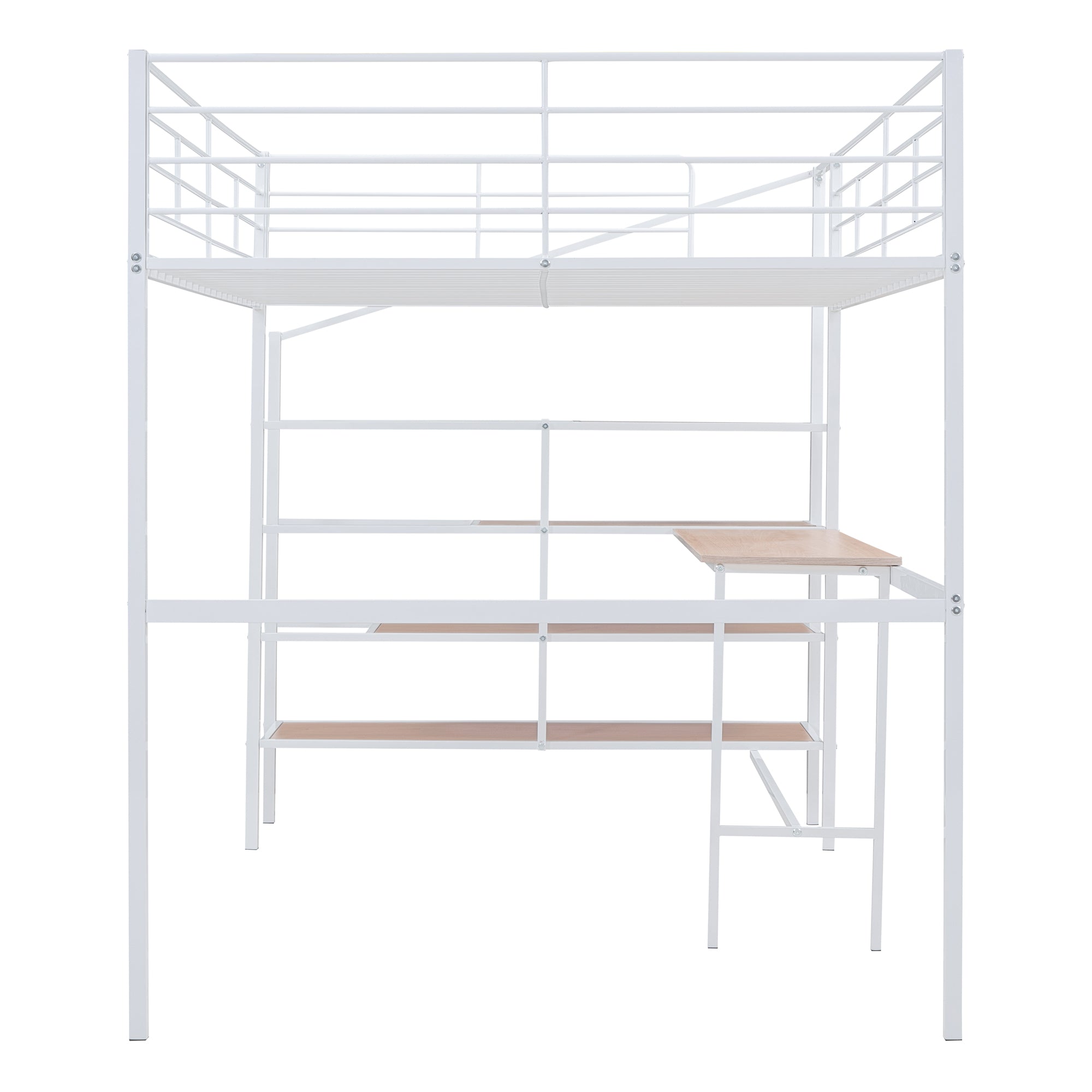 Transform your bedroom into a smart, space-saving sanctuary with this full-size metal loft bed. Built with sturdy metal framing and a sleek painted finish, the loft bed combines elevated sleeping space, a large integrated desk, and lateral ladder shelving to maximize functionality without sacrificing style. Ideal for students, small apartments, or multifunctional rooms, it creates an organized, comfortable area for sleeping, studying, and storage.