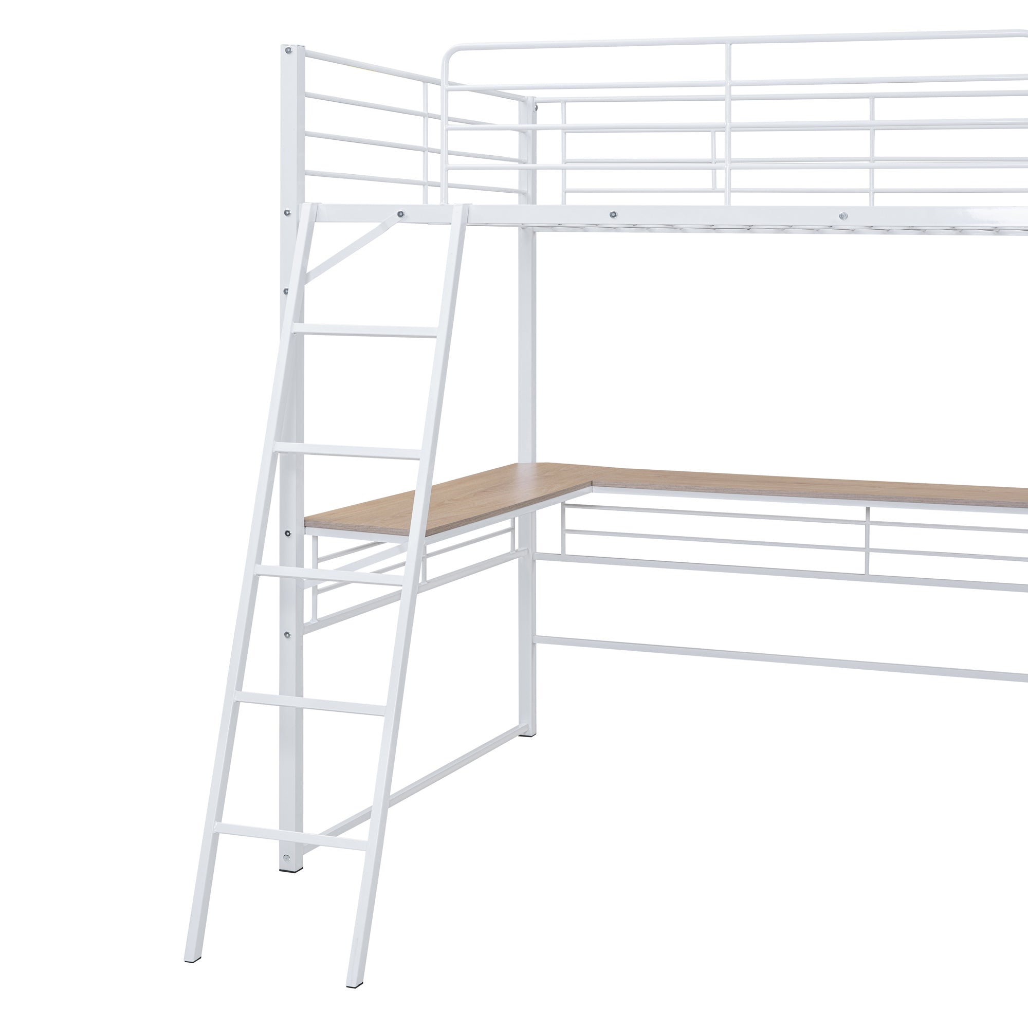 - Integrated Workspace: L-shaped desk built beneath the loft provides a dedicated work surface without taking up extra floor space