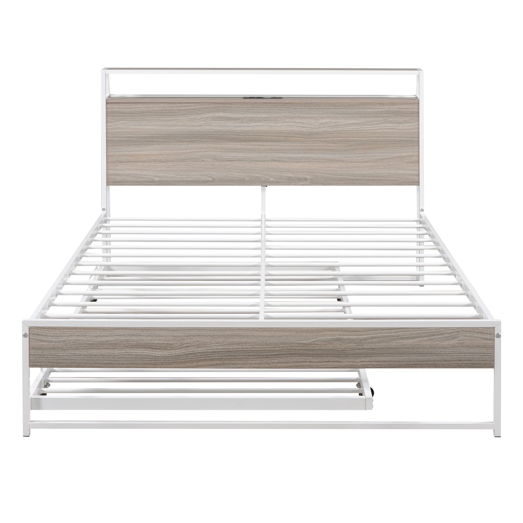 This modern metal platform bed with a convenient pull-out trundle blends industrial strength with warm wood accents to create a versatile centerpiece for your bedroom. Designed for everyday durability and easy use, it features integrated USB ports, sturdy slat support (no box spring required), and a low-profile, space-saving trundle ideal for guests, kids’ sleepovers, or added storage with a mattress. Available in Full and Queen sizes and in black or white to match rustic or contemporary décor.