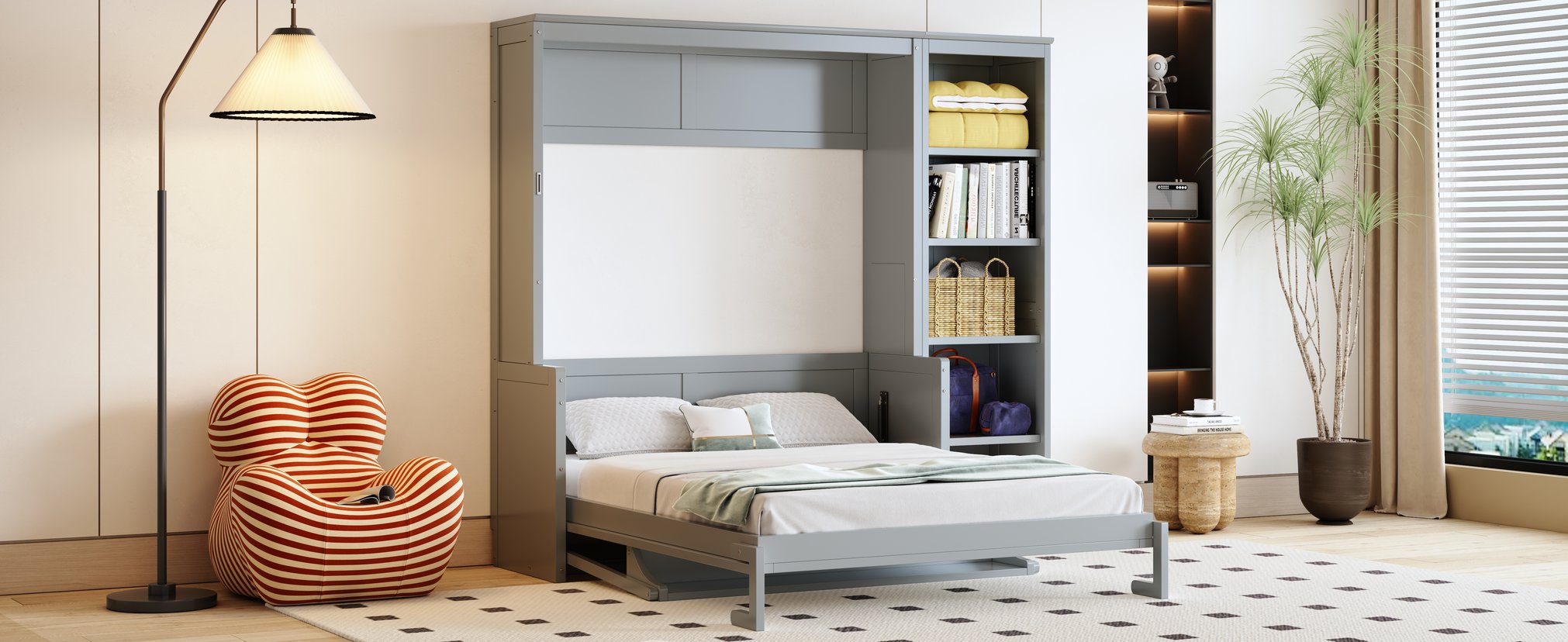 Transform your guest room, studio, or home office into a multifunctional space with this elegant black Murphy bed. Thoughtfully designed from pine wood and MDF, it blends the look of a storage cabinet with the comfort of a full-size bed, offering generous shelving and concealed storage for linens, clothing, and shoes. Easy to operate and sturdy in construction, it’s an ideal solution for maximizing space without sacrificing style.