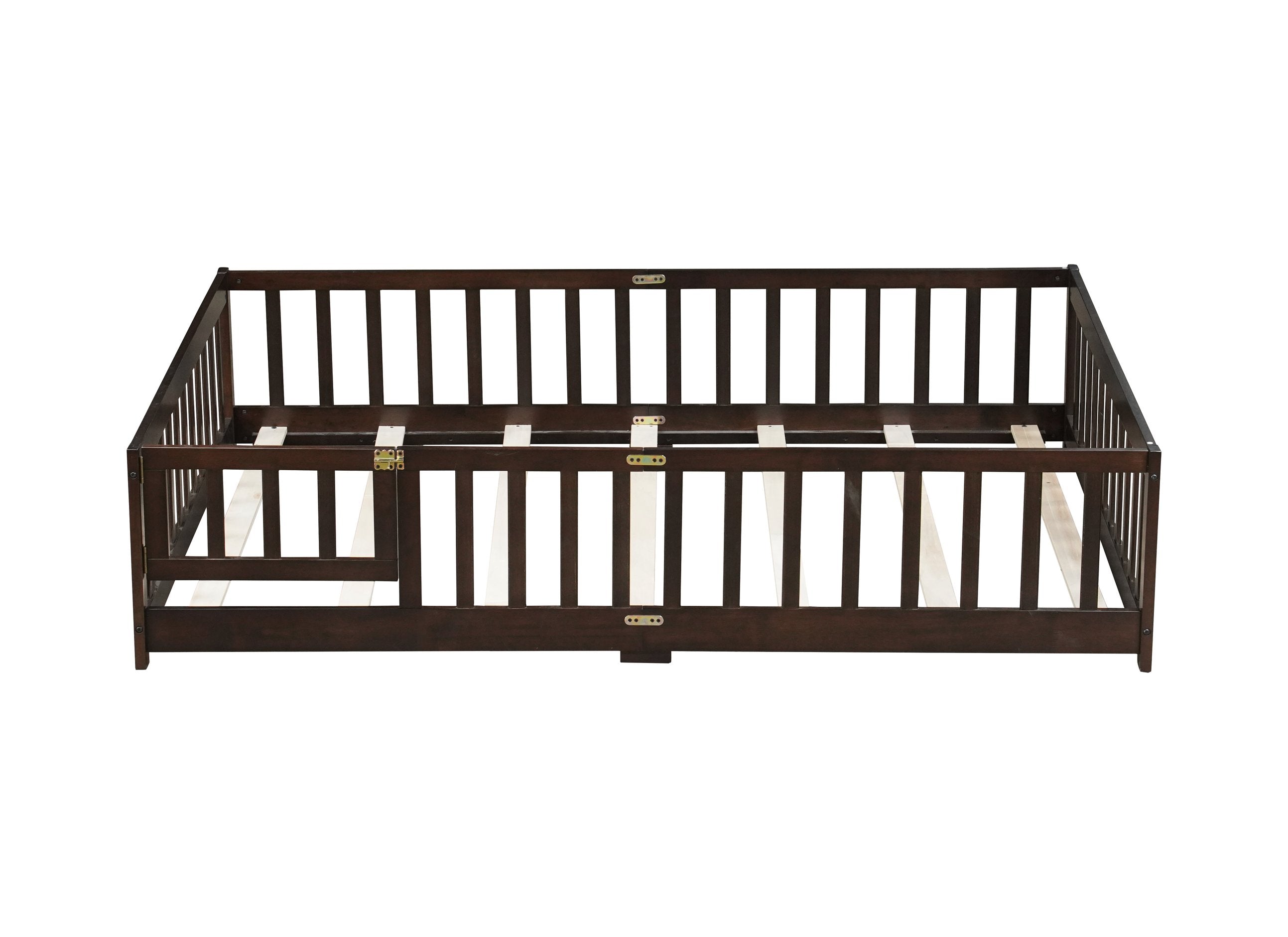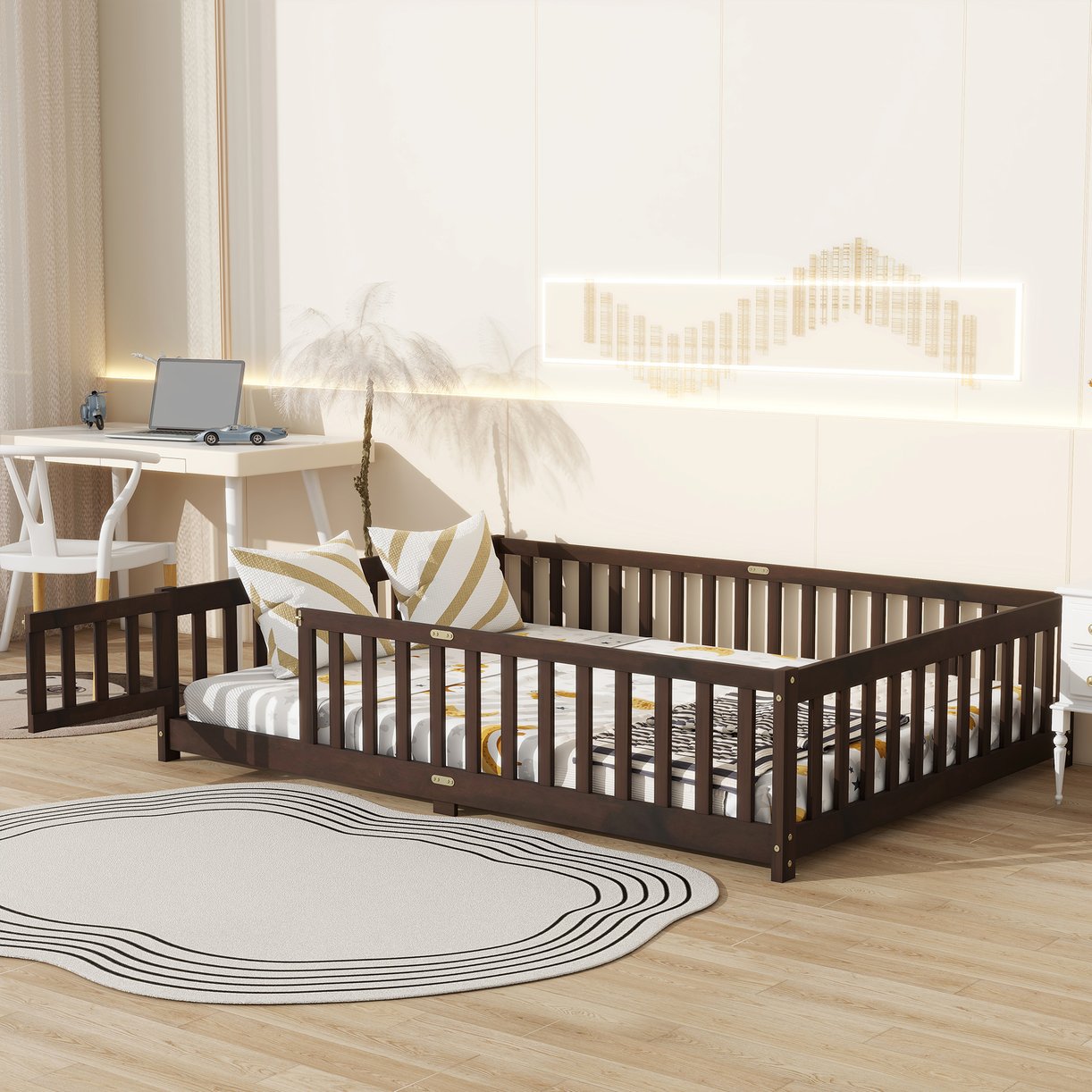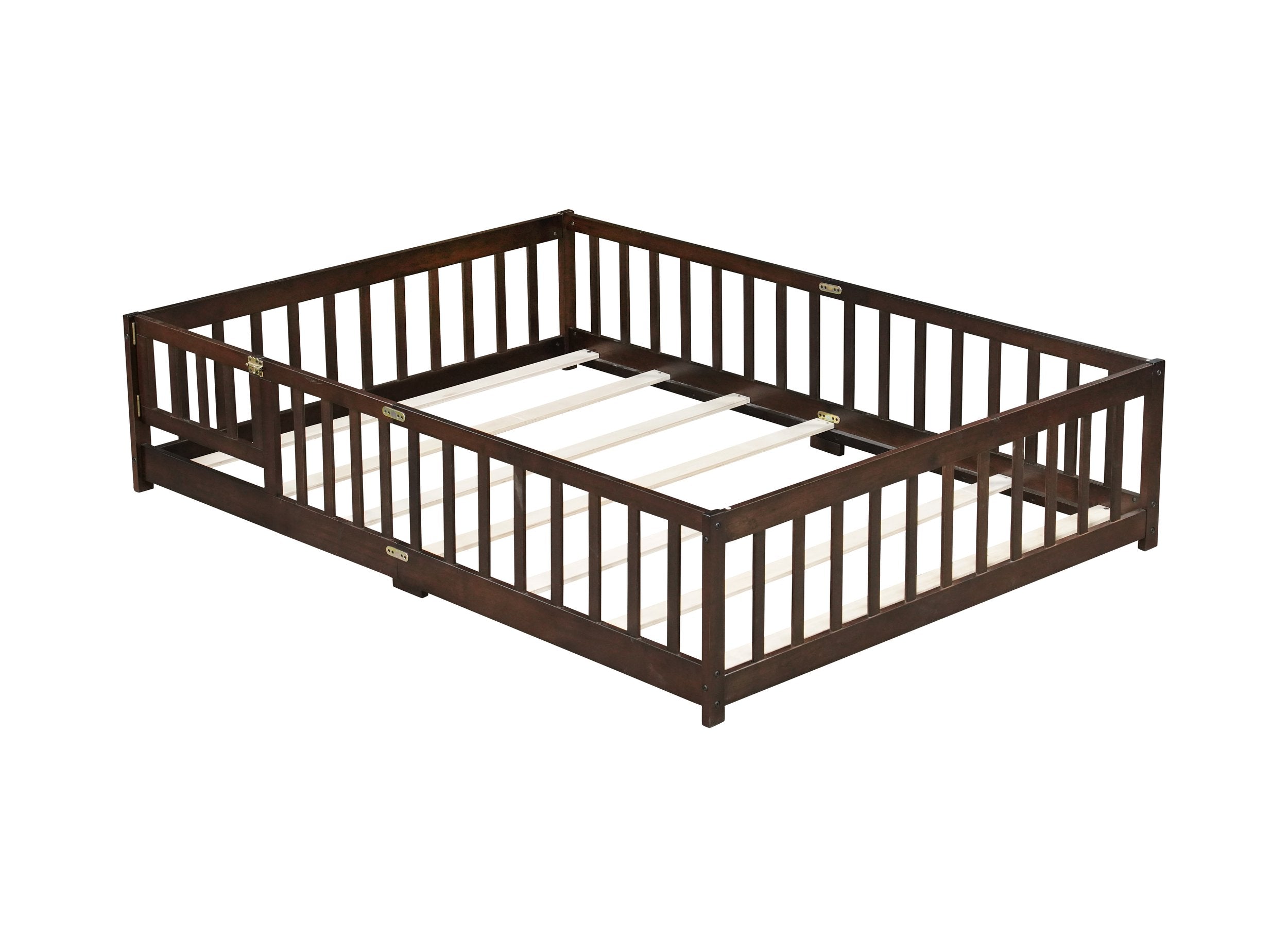 Give your bedroom a warm, grounded centerpiece with this full-size floor bed featuring a protective fence and convenient door. Crafted from solid rubberwood with an eco-friendly finish, this low-profile bed blends safety, durability, and simple assembly—ideal for contemporary, minimalist, or family-focused spaces. The fence and integrated door add security and easy access, while the sturdy slat system supports a mattress without the need for a spring box.