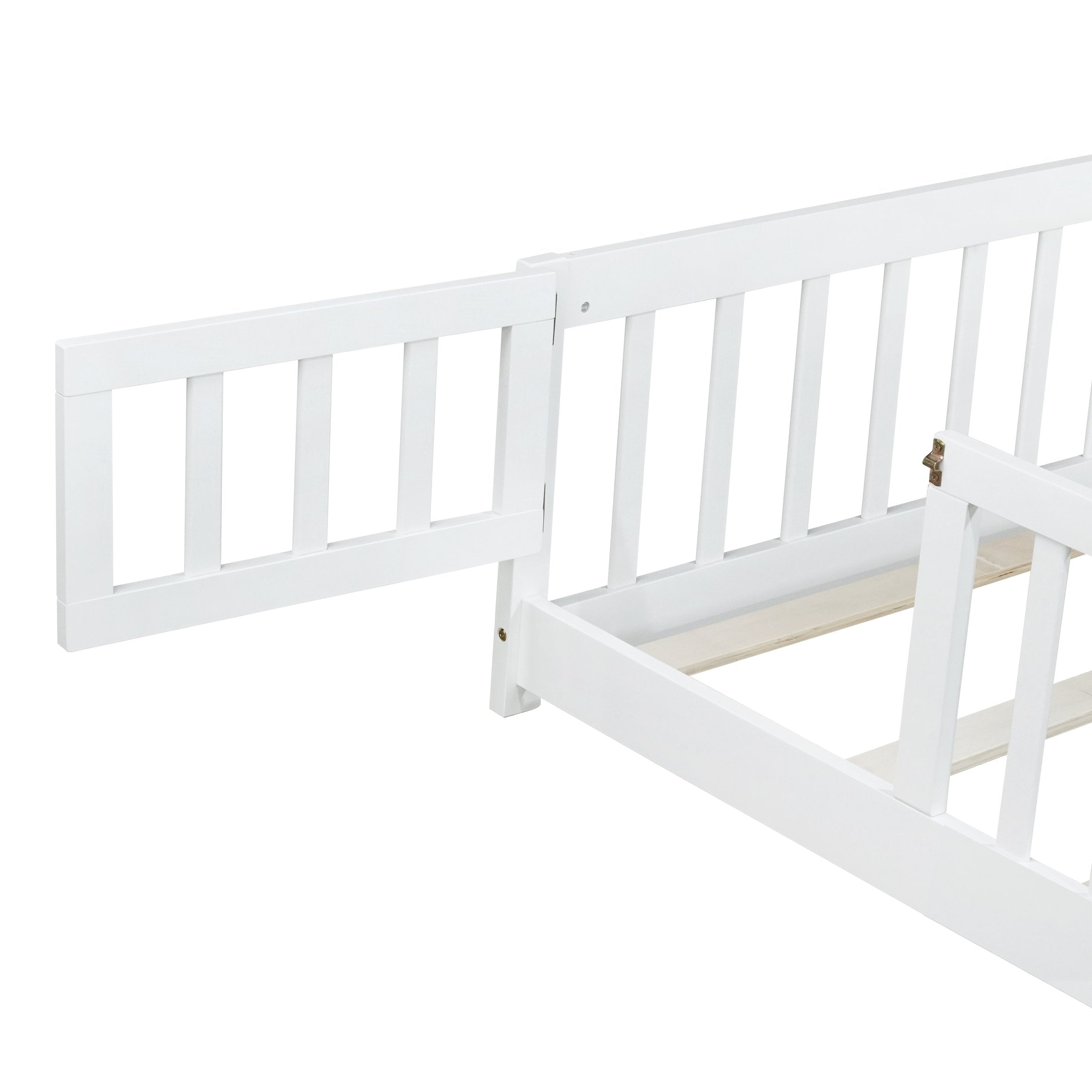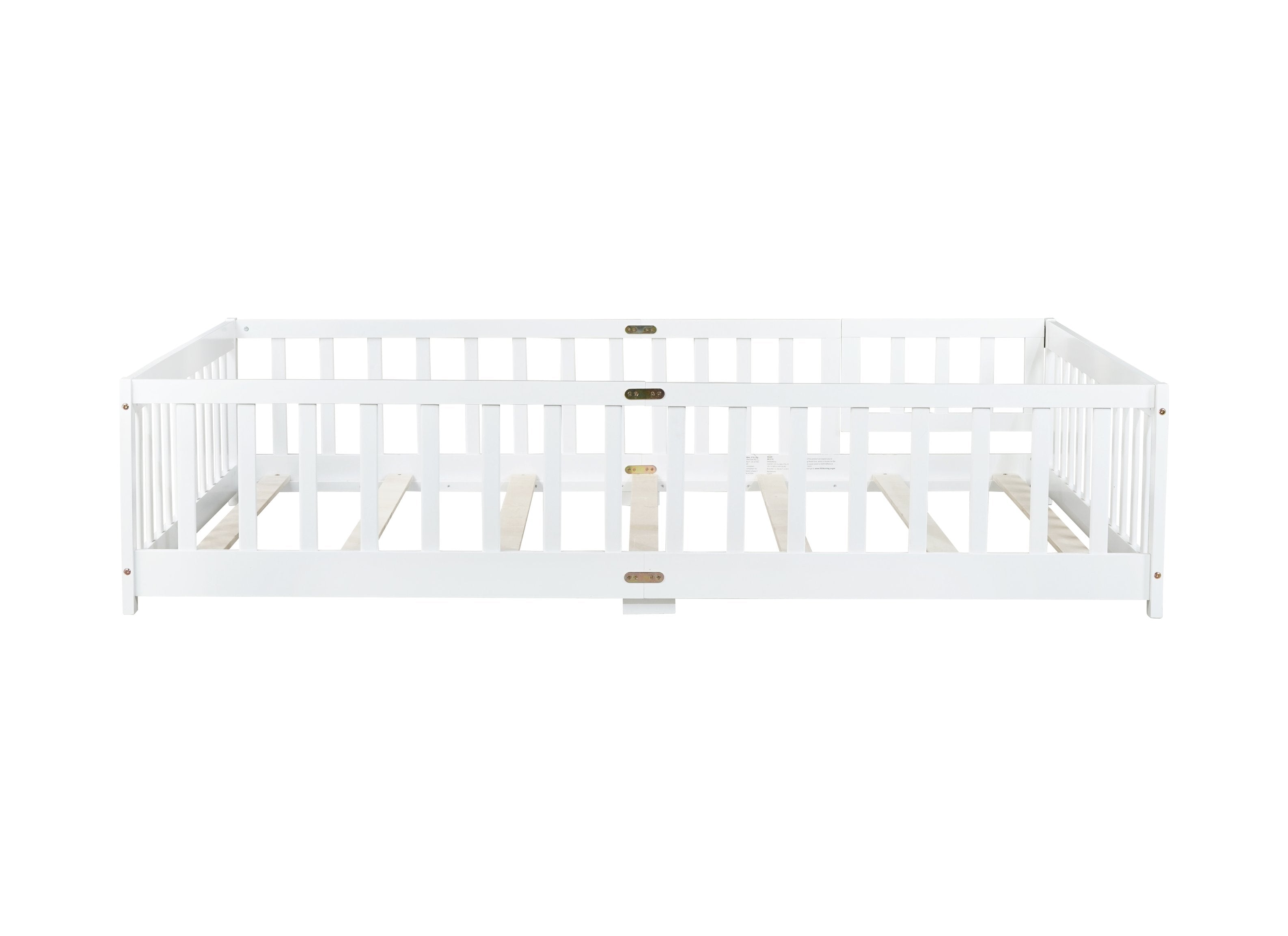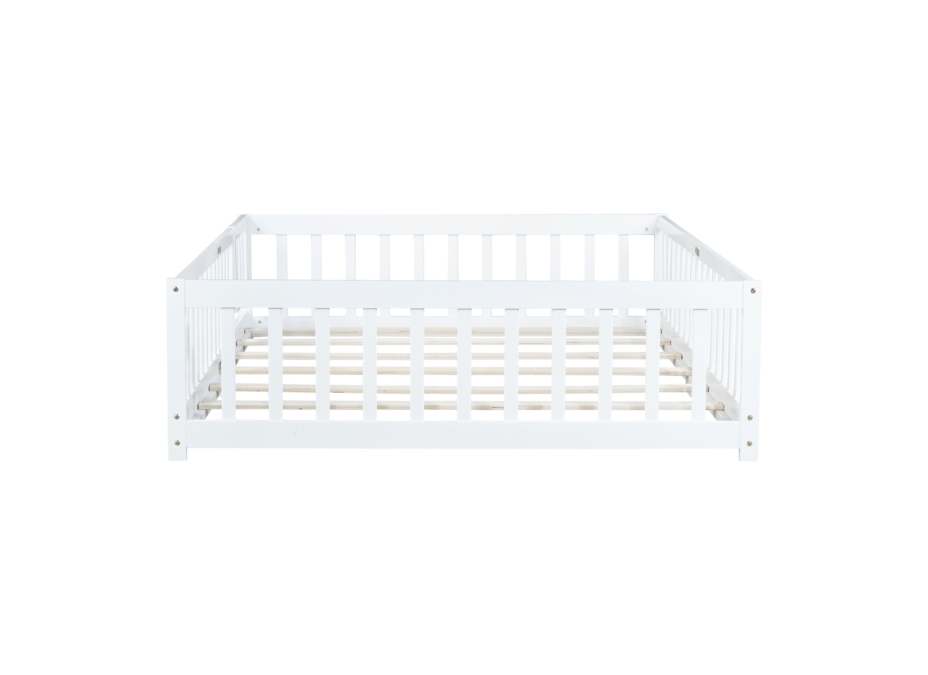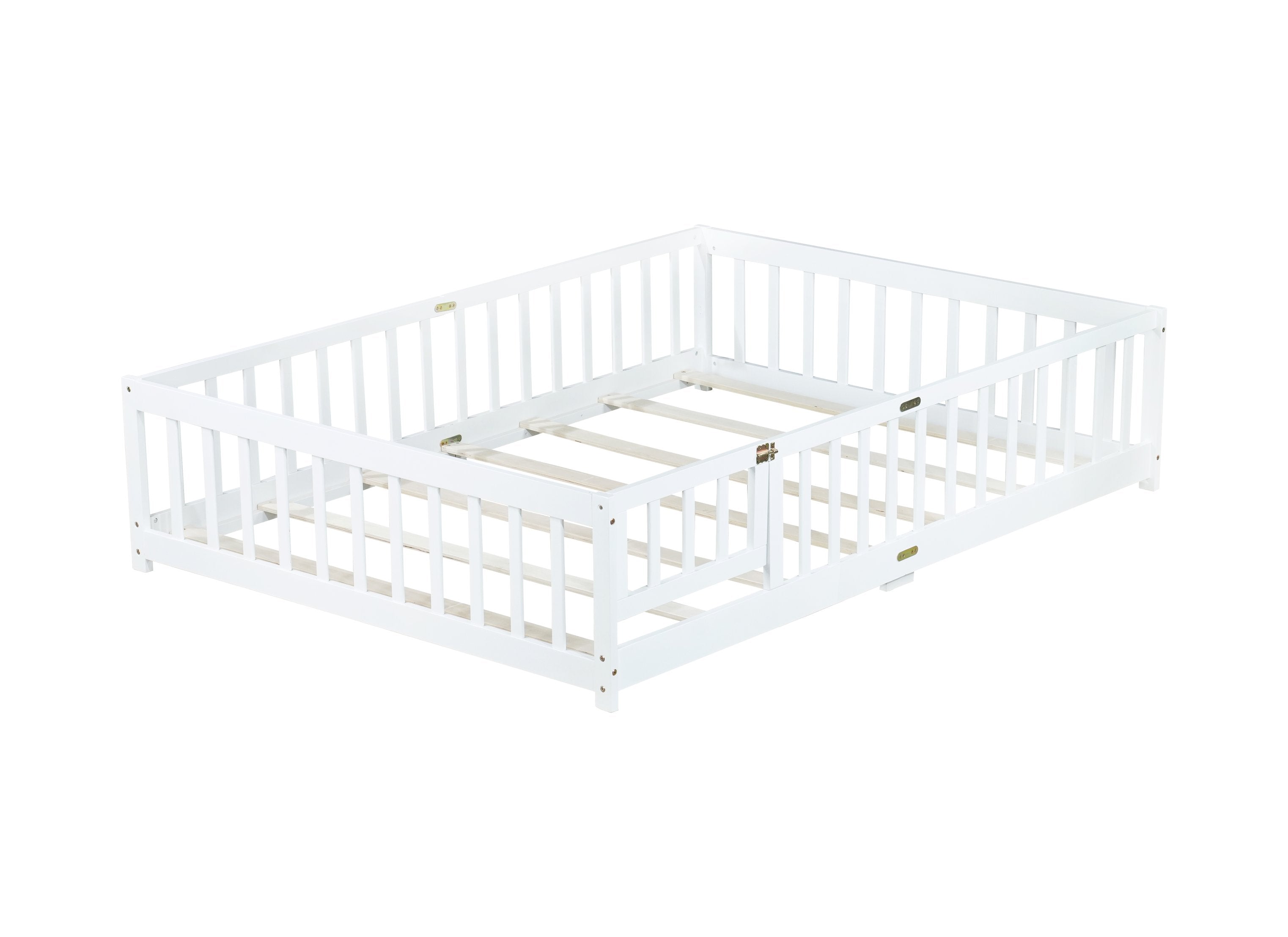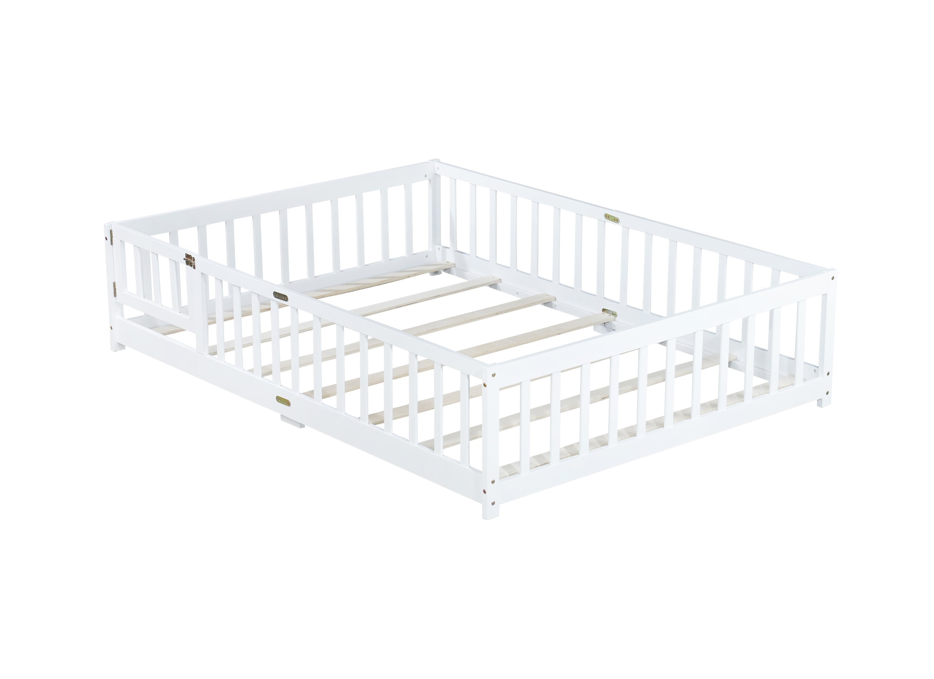 Give your bedroom a safe, stylish foundation with this full-size floor bed featuring a fenced design and convenient door access. Crafted from durable rubberwood and finished in a clean white, this low-profile bed combines sturdy construction with an eco-friendly paint for a healthy sleeping environment. Ideal for minimalist, contemporary, or children’s rooms, the bed’s guardrails and low height promote safety while keeping the look open and modern. Assembly is required but straightforward with the included manual and hardware.