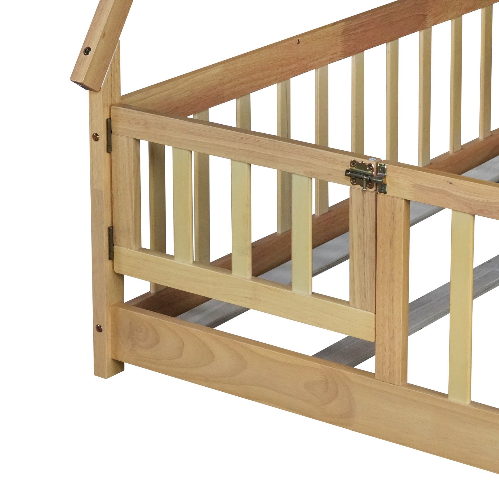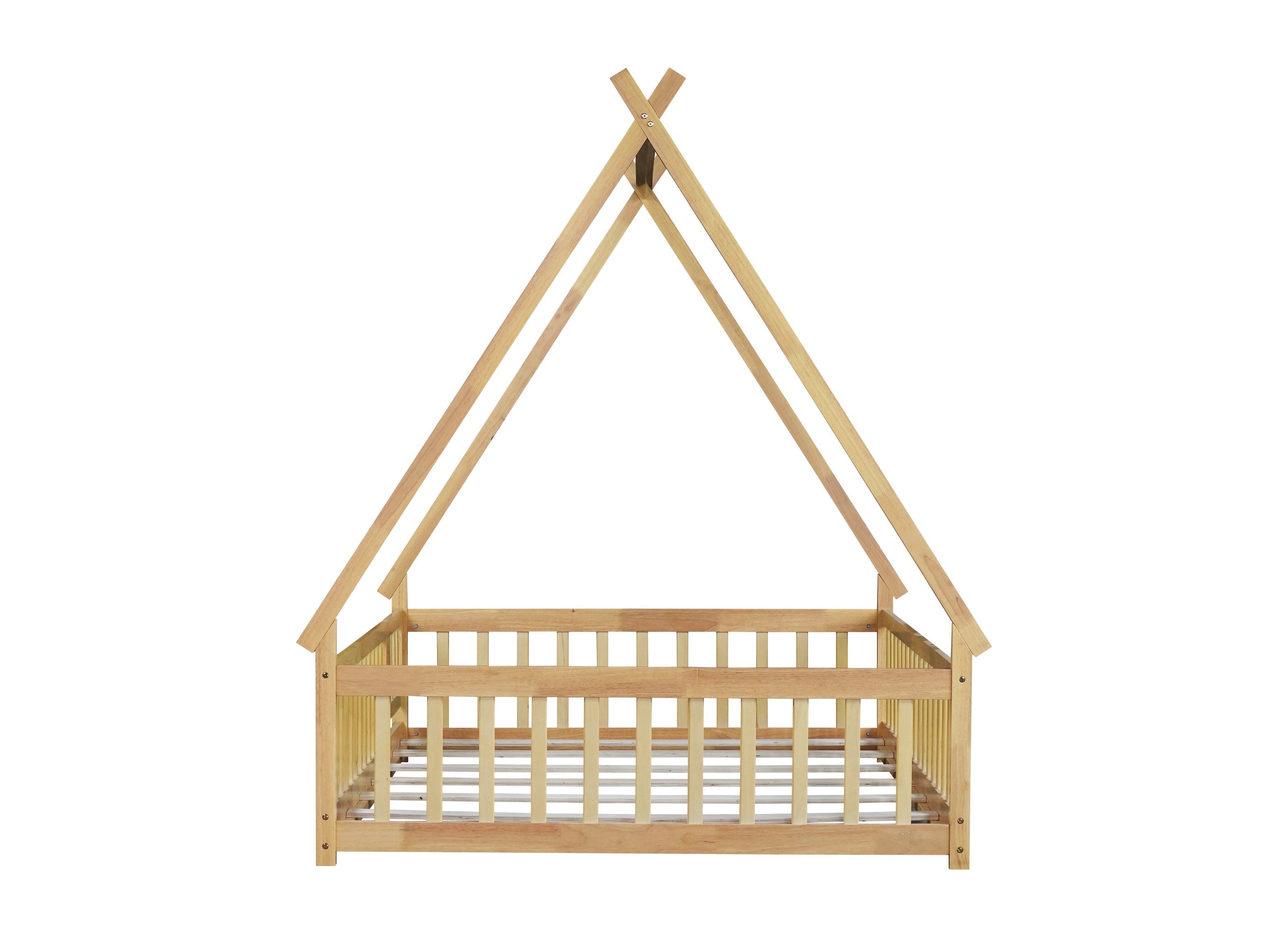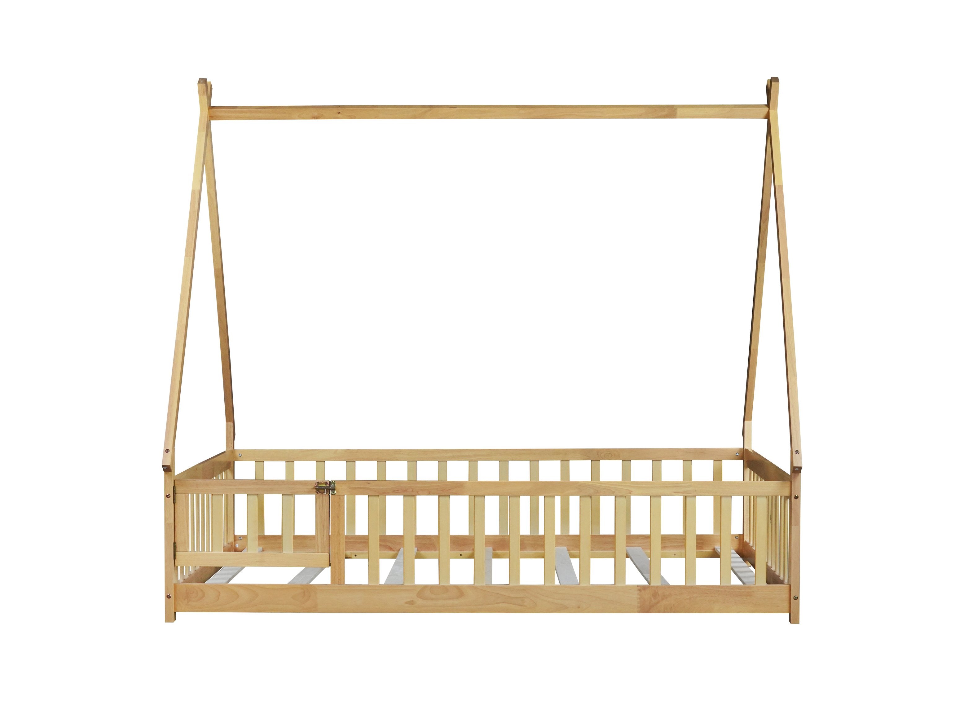 Bring a cozy, nature-inspired retreat into your bedroom with this tent-shaped full floor bed. Crafted from solid rubberwood with plywood elements, its teepee frame, integrated guardrails and functional door create a playful yet minimalist design that optimizes space and promotes a warm, family-friendly atmosphere. Built for simplicity and durability, this bed supports a low-profile mattress and includes slats—no box spring required—making it an ideal choice for a contemporary, nature-oriented interior.