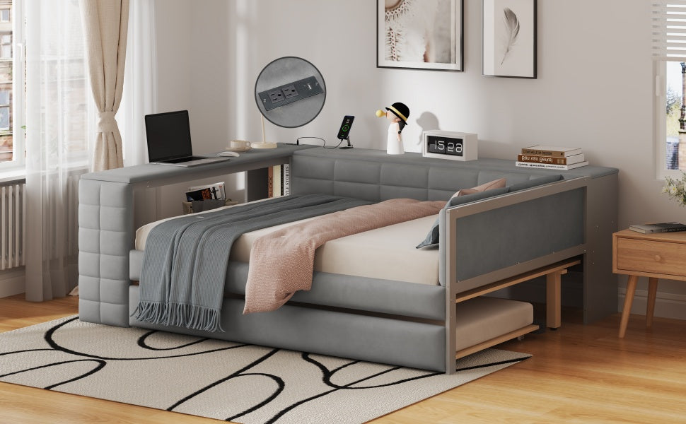 Bring practical elegance to your bedroom with this full-size upholstered platform bed — a thoughtfully designed centerpiece that combines clean modern lines with smart storage and guest-ready functionality. Upholstered in soft gray velvet, it features integrated shelves, a convenient charging station, and a pull-out trundle, delivering comfort and organization without sacrificing style.