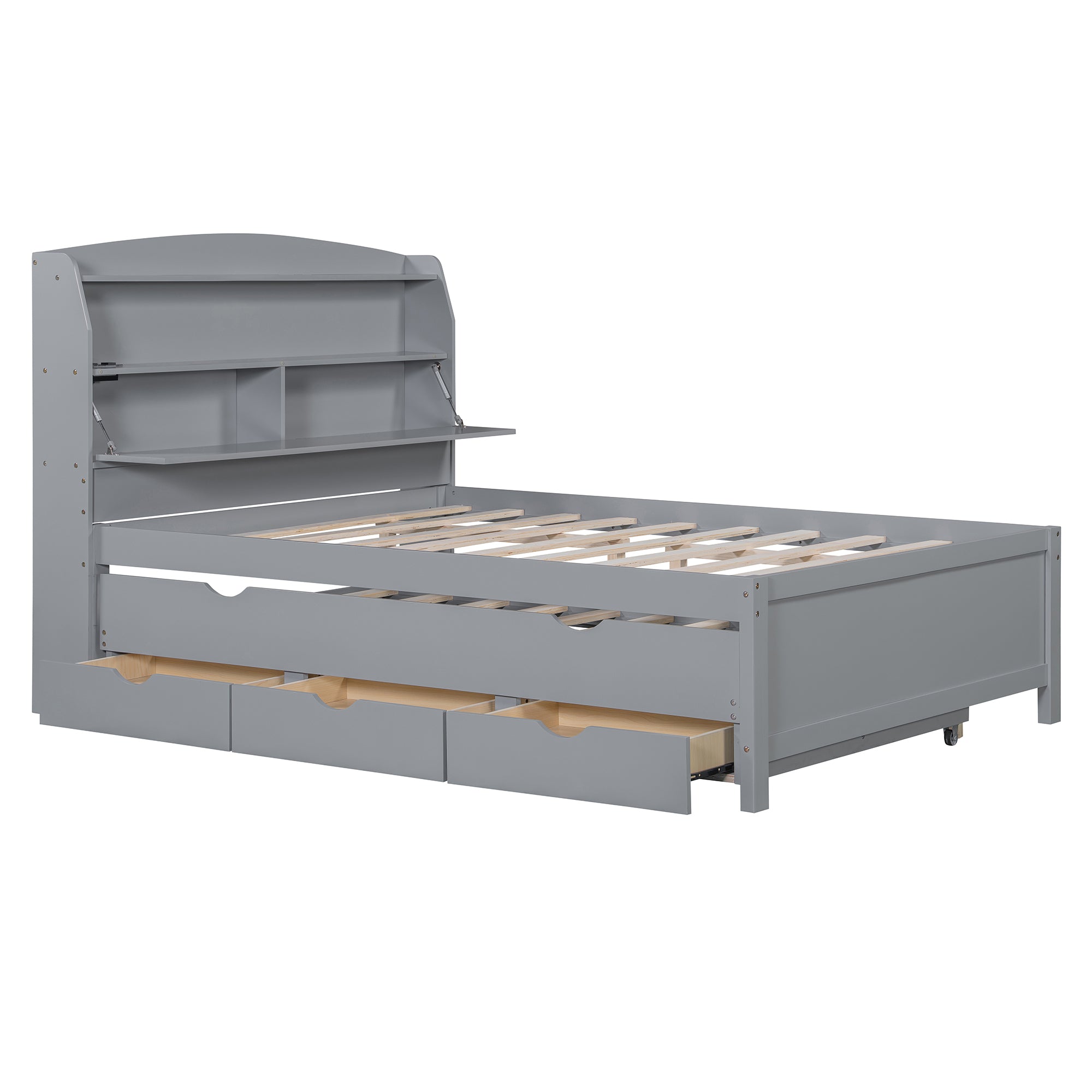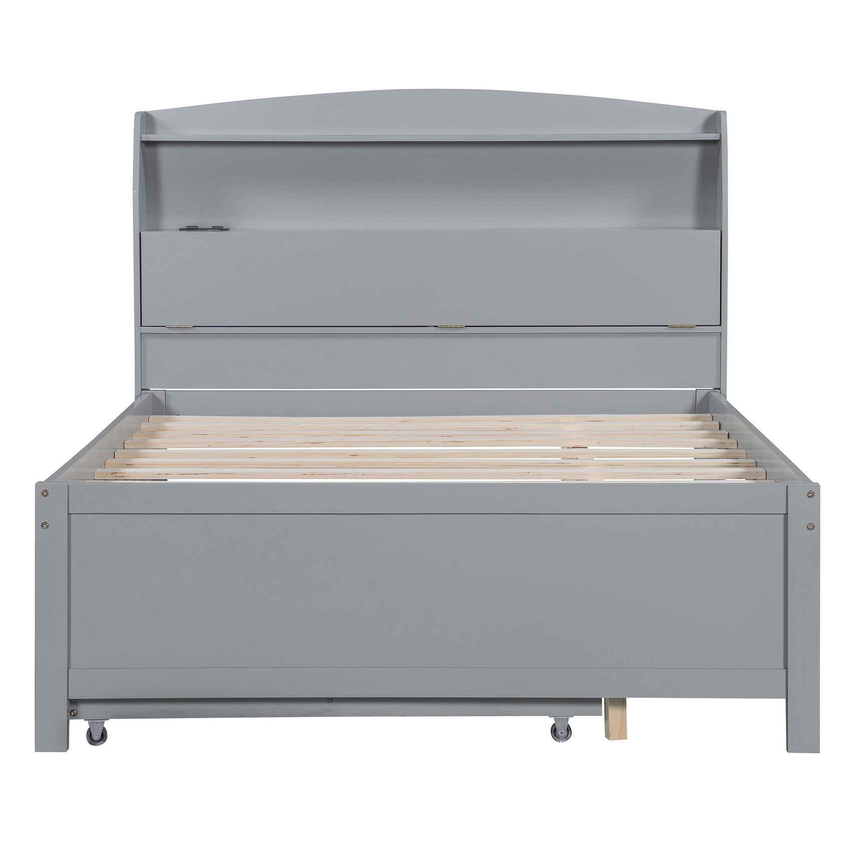 Bring style and smart storage to your bedroom with this full-size wooden platform bed featuring a convenient trundle, built-in LED lighting, and ample hidden compartments. Designed for modern living, it combines durable construction with thoughtful details—like USB charging ports and under-bed drawers—to keep your space organized and comfortable without sacrificing aesthetics.