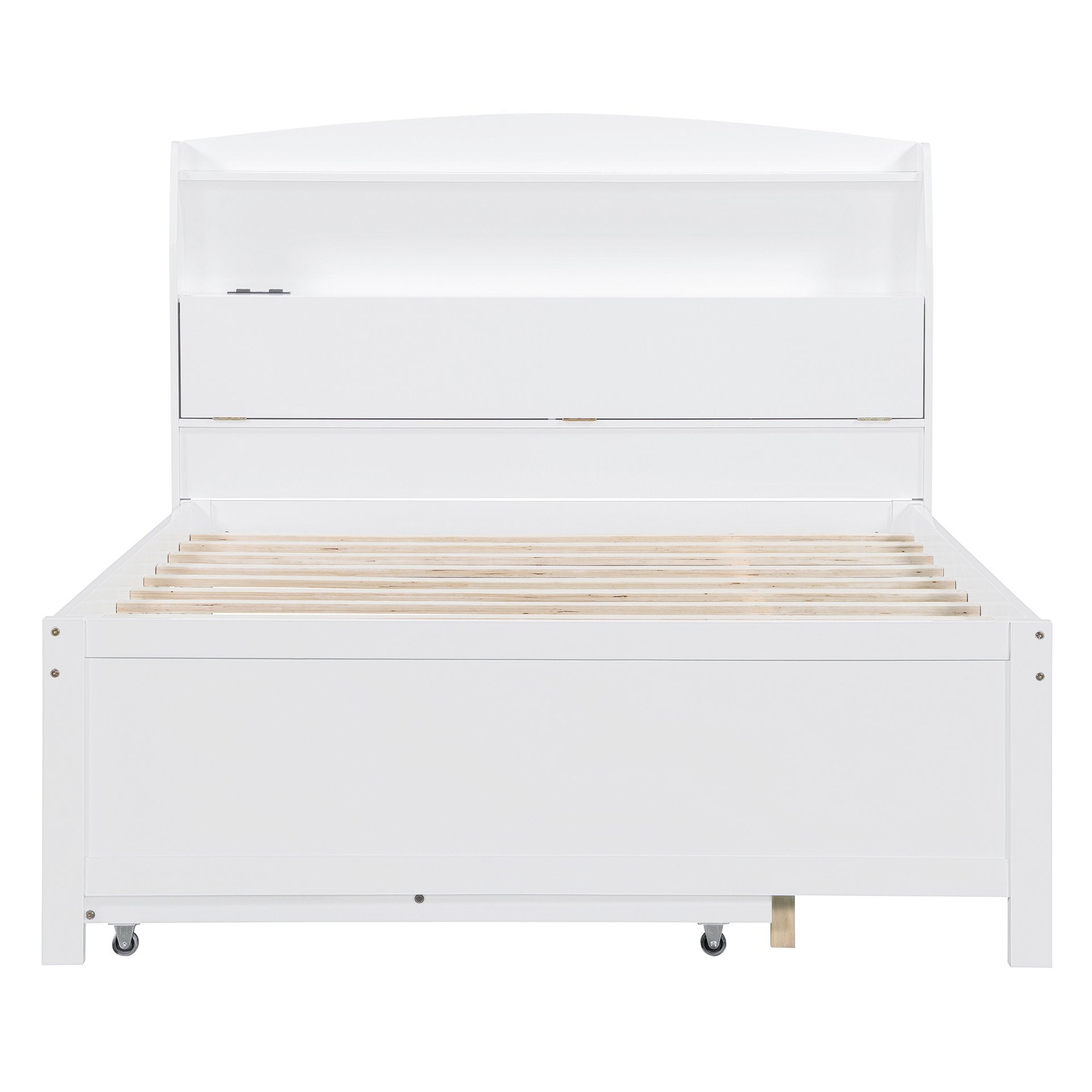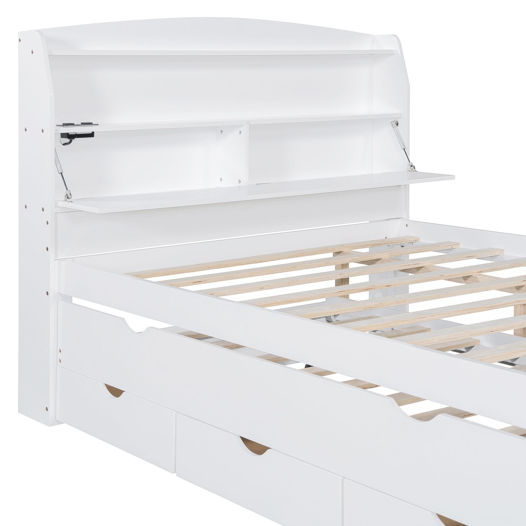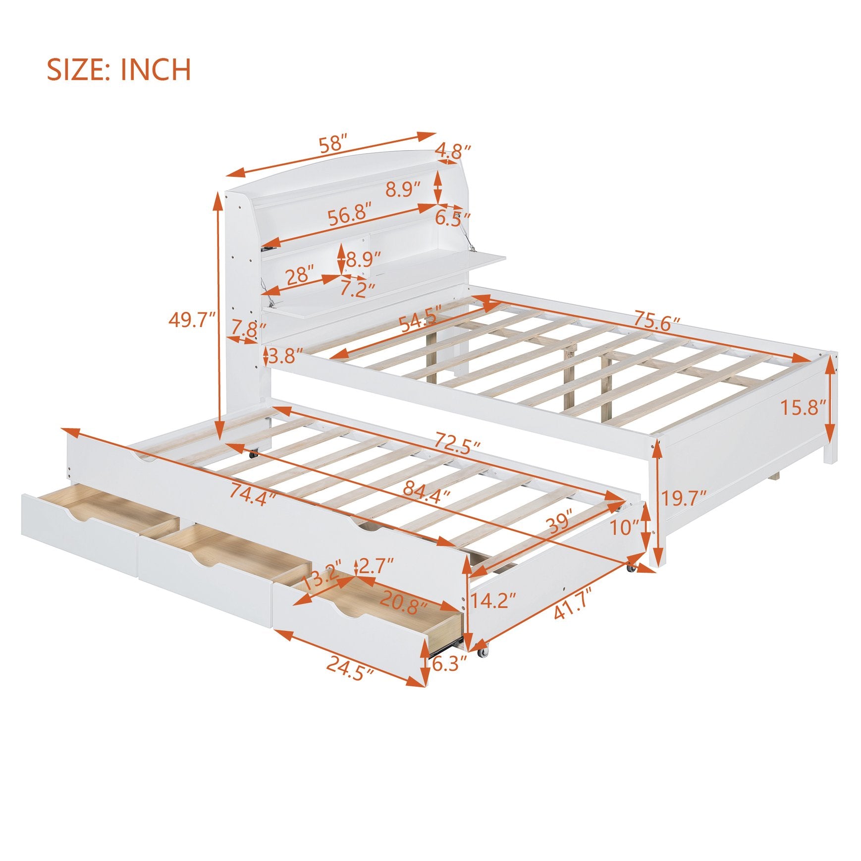 Bring smart storage and modern convenience to your bedroom with this full-size wooden platform bed. Designed for everyday functionality, it combines a flip-up headboard compartment, built-in LED lighting and USB outlets, a pull-out trundle, and under-bed drawers to keep essentials organized while maintaining a clean, contemporary look.