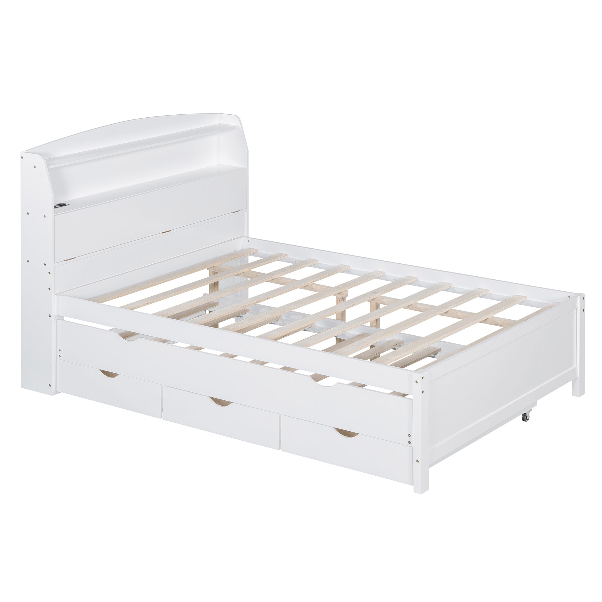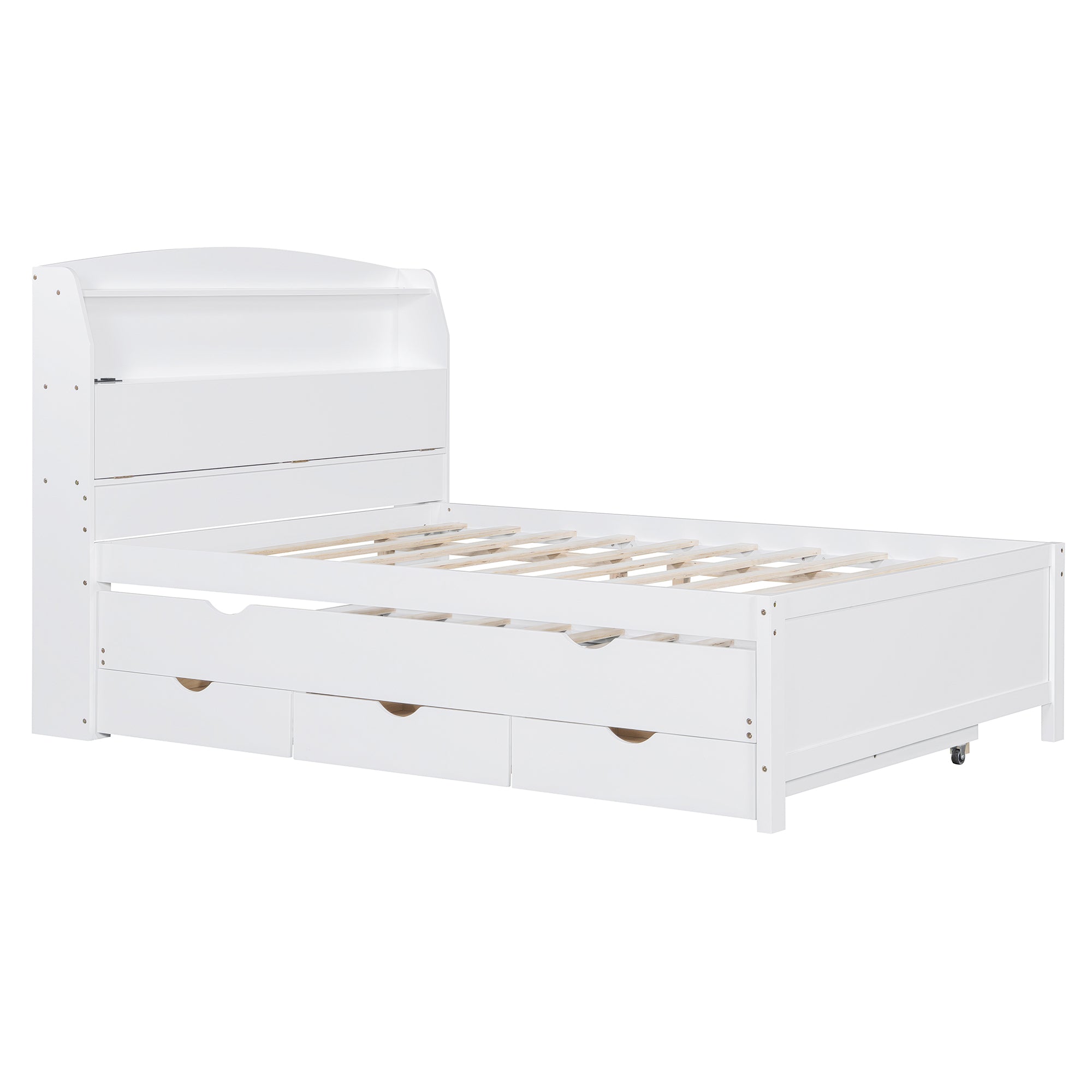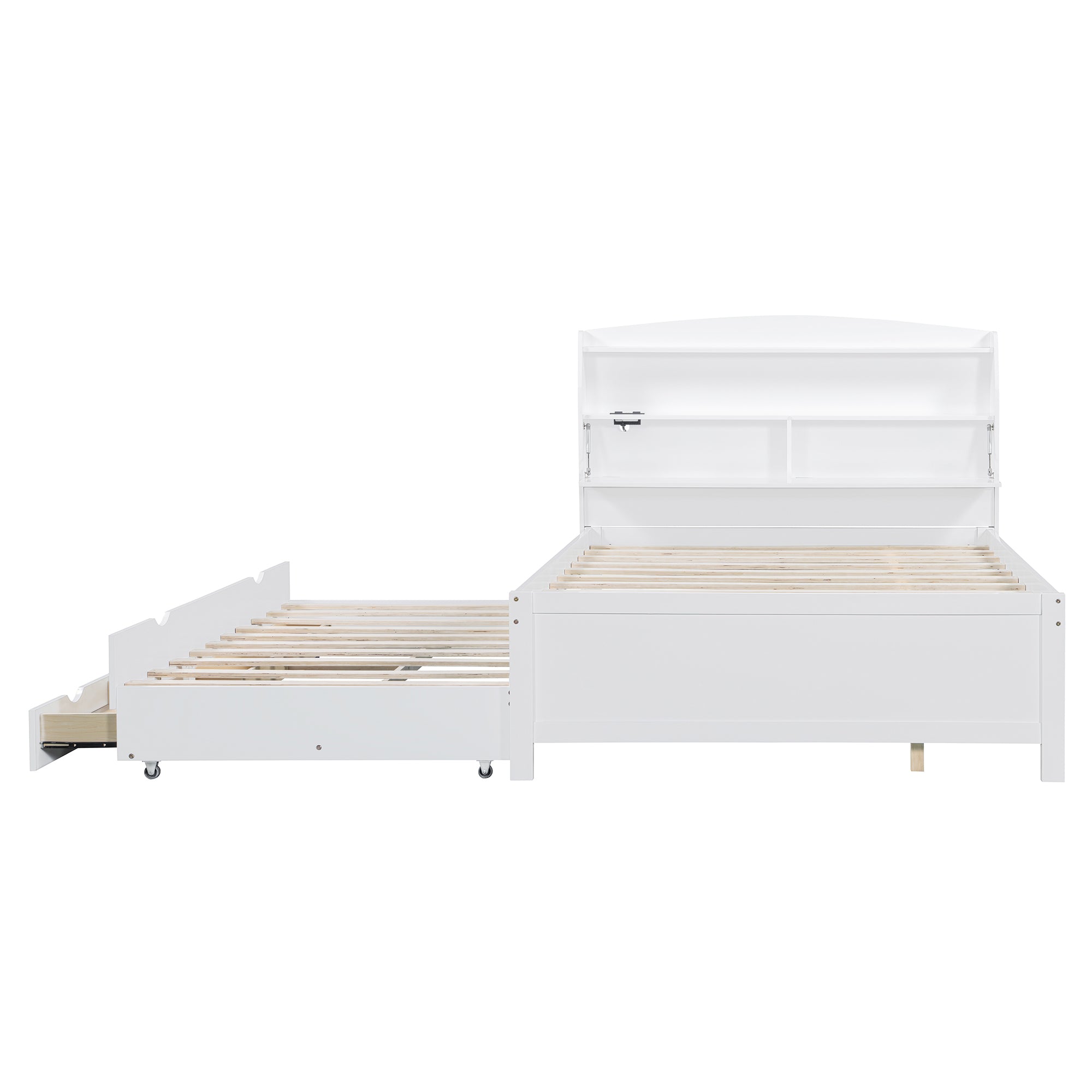Bring smart storage and modern convenience to your bedroom with this full-size wooden platform bed. Designed for everyday functionality, it combines a flip-up headboard compartment, built-in LED lighting and USB outlets, a pull-out trundle, and under-bed drawers to keep essentials organized while maintaining a clean, contemporary look.