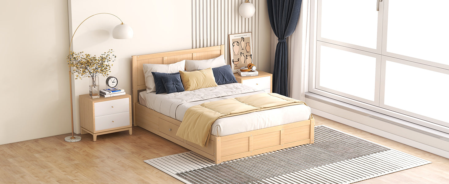 This full-size wood platform bed blends simple, natural styling with practical storage to maximize space in smaller bedrooms. Built from pine and MDF with a sturdy slat system, it offers reliable support without the need for a box spring, while two built-in drawers and additional under-bed storage keep essentials organized and out of sight.