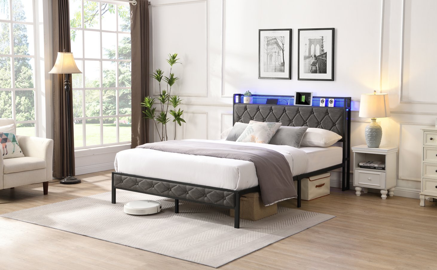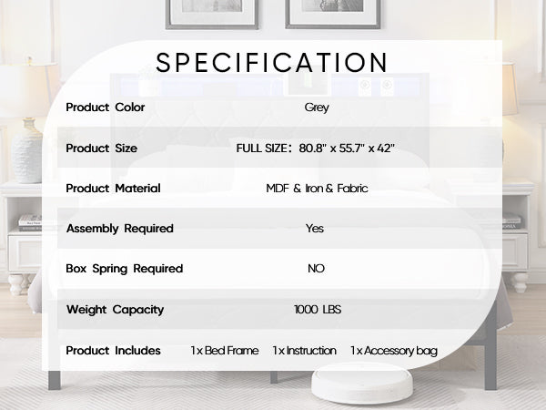 Elevate your bedroom with a modern, functional platform bed that blends style, storage, and smart features. Upholstered in breathable, wear-resistant gray linen, this full-size bed delivers a clean, contemporary look while providing practical conveniences—integrated LED mood lighting, fast charging ports, and a hidden headboard shelf—so your essentials and devices are always within reach. Built on a sturdy metal frame with heavy-duty slats and noise-reducing features, it supports your mattress without a box spring for a quiet, comfortable sleep experience.