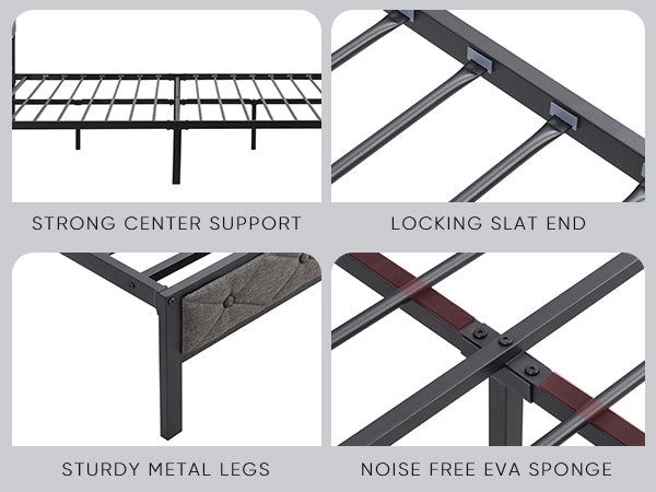 - Sturdy & Noise Free Design: Full bed frame with headboard and storage made of sturdy metal structure, 17 heavy duty metal slats and 11 support legs provide optimal support for all types of mattresses without the use of box springs. we've added a special silent sponge bar to the center beam of this platform bed to eliminate friction between the metal components to ensure your sleep environment, Sleep or be active in this bed without being disturbed by noise.