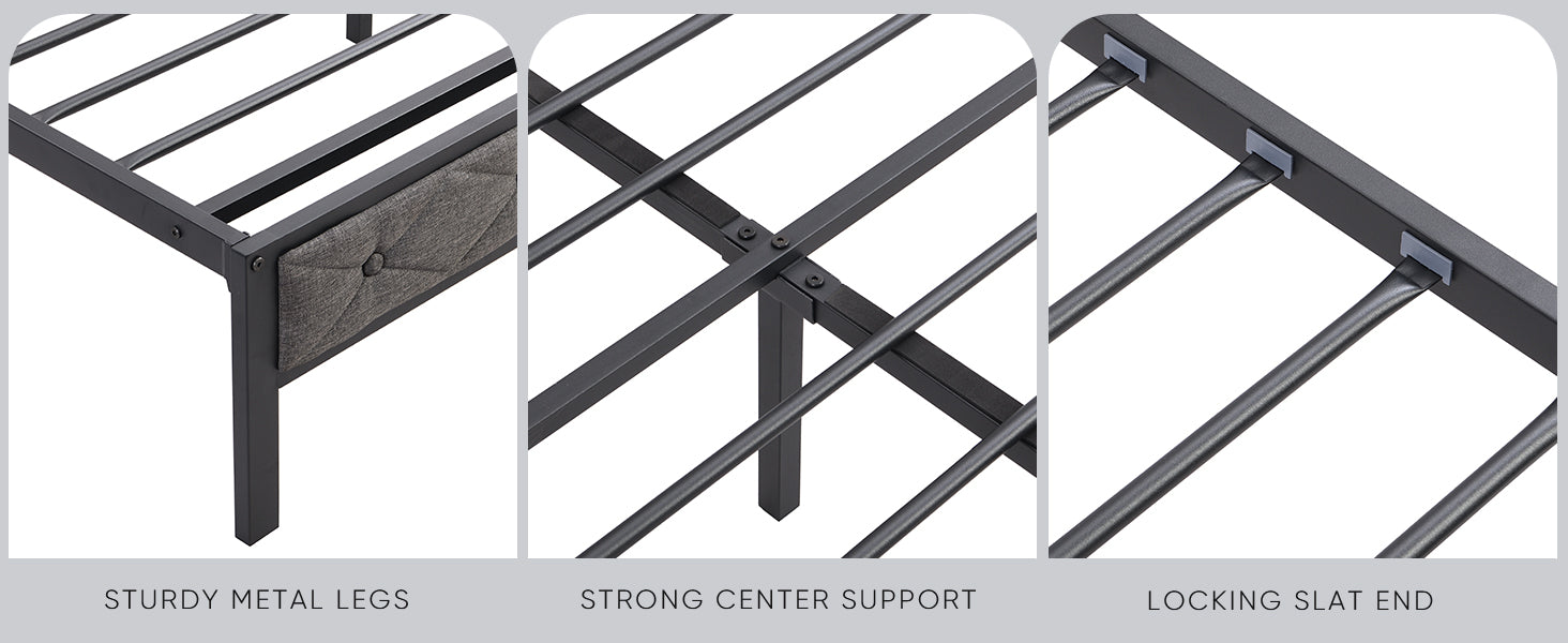- Size & Construction: Full-size upholstered platform bed with heavy metal frame, 17 metal slats and 11 support legs for reinforced mattress support—no box spring required.