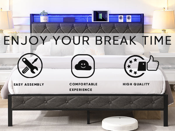 - Easy Assembly & Smart Packing: Everything you need for painless setup of this queen bed frame with LED lights is efficiently packed in ONE box and shipped directly to your door; and the assembly instructions are clear and easy to follow, 2 person assembly of this queen bed frame with headboard takes less than an hour. If you need to move house, our queen size bed is very easy to disassemble and can be easily packed into a carton, which can be easily placed in the car trunk for transportation.