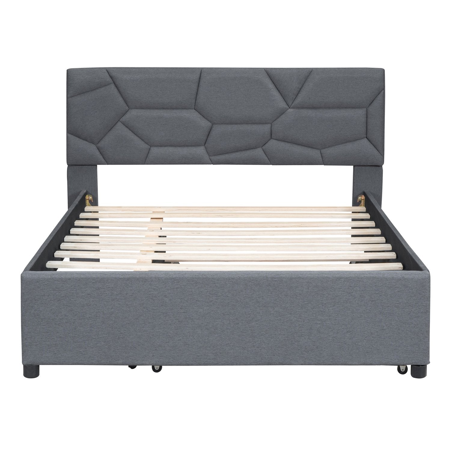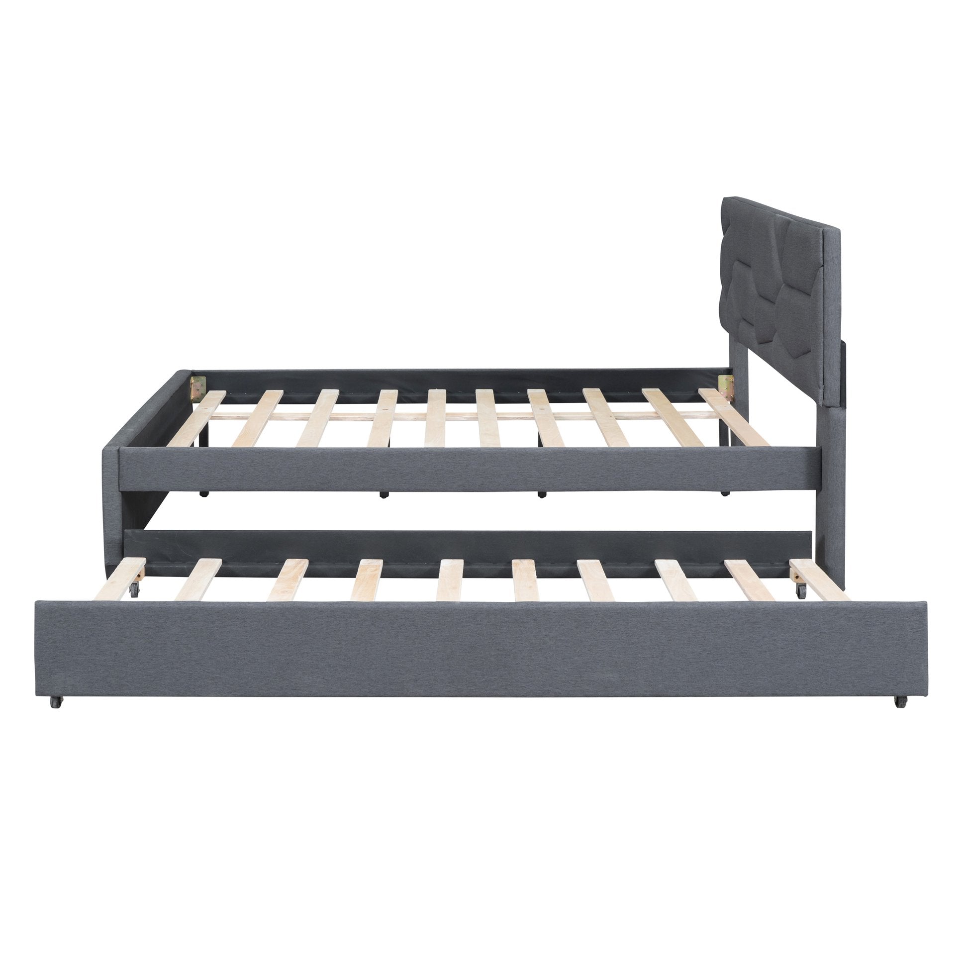 Transform your bedroom into a modern, comfortable retreat with this upholstered full-size platform bed. The chic brick-pattern headboard, wrapped in linen fabric and padded with thick foam, offers both style and support while the included twin trundle maximizes sleeping space for guests or family. Built on a sturdy plywood and MDF frame with a wooden slat system, this bed delivers stability and easy assembly—hardware and clear instructions are included so two people can set it up in about 30 minutes without power tools.